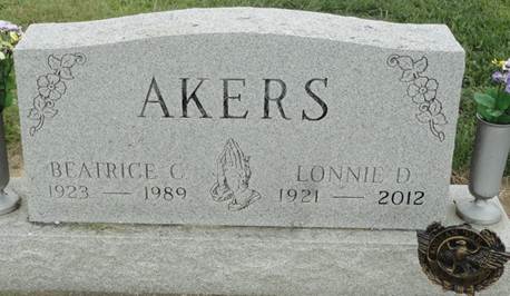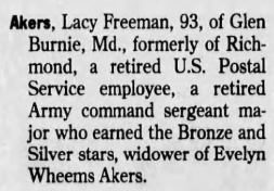 with parents. 1930 Residence: Anne Arundel Co., Maryland, Fort George G. Meade: Akers Lacey F. 23 yo w/m soldier, b. VA, parents b. VA. 1940: 1946 Marriage #1: He m. Evelyn Lillian Wemes 3-9-1946 KY. Evelyn Lillian Wemes, 1912-1995, d/o Isaac & Mary (Gagel) Wemes. [Death Cert]