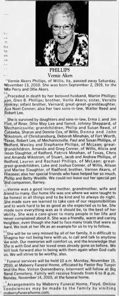 Parents: Woody Isaac & Toye Nettie (Duncan) Akers. 1924 Birth: abt 1924 VA. 1930 Residence: Radford City, VA with parents. 1940 Residence: Floyd Co., VA with parents. 1943 Marriage #1: Gertrude Akers m. Willard Reed 9-1-1943 Floyd Co., VA. He 24 yo single w/m ex soldier, b. Floyd, s/o Abraham Reed & Minerva Alley. She 19 yo single w/f, b. Floyd, d/o Woodie Akers & Toy Duncan. Willard Taylor Reed, 1919-1976, s/o Abraham Taylor & Minerva Susan (Alley) Reed. [Reed_MarkA_LucyA] Divorce: Virginia & Willard divorced 1946 Delaware Co., IN. 1949 Marriage #2: Virginia G. Reed m. James B. Martin 6-18-1949 Delaware Co., IN. James Barnum Martin, s/o Jack L. D. & Dorothy Irene (Taylor) Martin. 2012 Death: 12-29-2012 of 1104 West Haines Ave, Muncie, Delaware Co., IN.