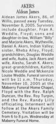 >From Clyde Maxey 1/09/03 to Kasia Johnson> Velta was an Akers and James was her great grandfather. He supposedly froze to death while going fron one son's house to another. Another story is that he was coming from church and was found in a kneeling position with his bible in his hand, either could be true due to the date of his death. We have a considerable amount of data on Brooks, Velta's grandfather, but not a lot before that. Earl Aker's site is probably the best online site. It seems that William Akers lived in England and that is where the line you are on comes from down through Wm 2nd and Wm 3rd and then to Blackburn etc. I have some books compiled by various people about the Akers families and there so many mistakes in them that I am afraid to quote any of them. I suspect you are looking at Nancy's family because she married Lloyd Thompson. Velta's mother and father were cousins, but I have forgotten exactly how. Now I remember they both descended through Adam Akers. I will have to dig out my book to find out the exact line. Someday I am going to put all of this data on the computer if someday ever gets here. Another note from Ole Clyde, 1/15/03, to the Floyd Co., VA Newslist Subj: [VAFLOYD] Little Jim Akers I thought I would muddy the waters a little as far as James "little jim" Akers is concerned. The following is from a paper by Lucy Hudson Akers, a daughter-in-law of Brooks. She says that Brooks told her this as he would sit in his chair and she would be cleaning up the house. She says that Jonathan was married to Rebecca Kunode who was raised in England. They were the parents of James who was one of their six children. James married Sarah Reed in 1840. They had eight children, six boys and two girls. George, Jonathan, Ed, Brooks, Psaulters and William. The girls were Elizabeth and Nancy. George and Jonathan fought in the civil war. George was killed at the battle of Bull Run. Jonathan was wounded, being shot through the mouth and about the face. (note: family lore has it that Jonathan had deserted and knew that the soldiers were seeking him, so he dressed in his mother's clothes and was sitting at the spinning wheel when they came. Apparently they didn't check very close) Brooks' grandfather died during the first year of the war Becky died at the age of 95 during the second year from nosebleed. James was the first schoolteacher in these parts and built the first schoolhouse in the neighborhood. It was built from logs and it was just one room. He taught for fifty cents per month for each child often taking his pay in foodstuff. He also did public writing, such as deeds and such documents. In 1868 he helped build the log cabin for his son Jonathan which later became the home of his son Brooks. It was in this house that Sarah/Sally died in early Eightys. James lived alone for a while, later marrying Nancy Leffew who was the spinster aunt of Brooks' wife Louise. James had been used to being a free spirit and couldn't adapt himself to the peculiar ways of the spinster woman. They only lived together for a short time and then he lived among his children. He was found dead one wintery day near his son Ed's house. (Note: some say he froze to death) He was on his knees as if he were praying. The letter stops here with the word "continued" but no one has seen any more writing. I don't know if she stopped there or if she wrote more and it was lost. I wish I could have received this letter before she passed away. The Notes are mine. I have a James Akers 76 wid marrying a Nancy Lefew 60 wid on August 10, 1891. Parents Jonathan and Rebecca. jist ole clyde |