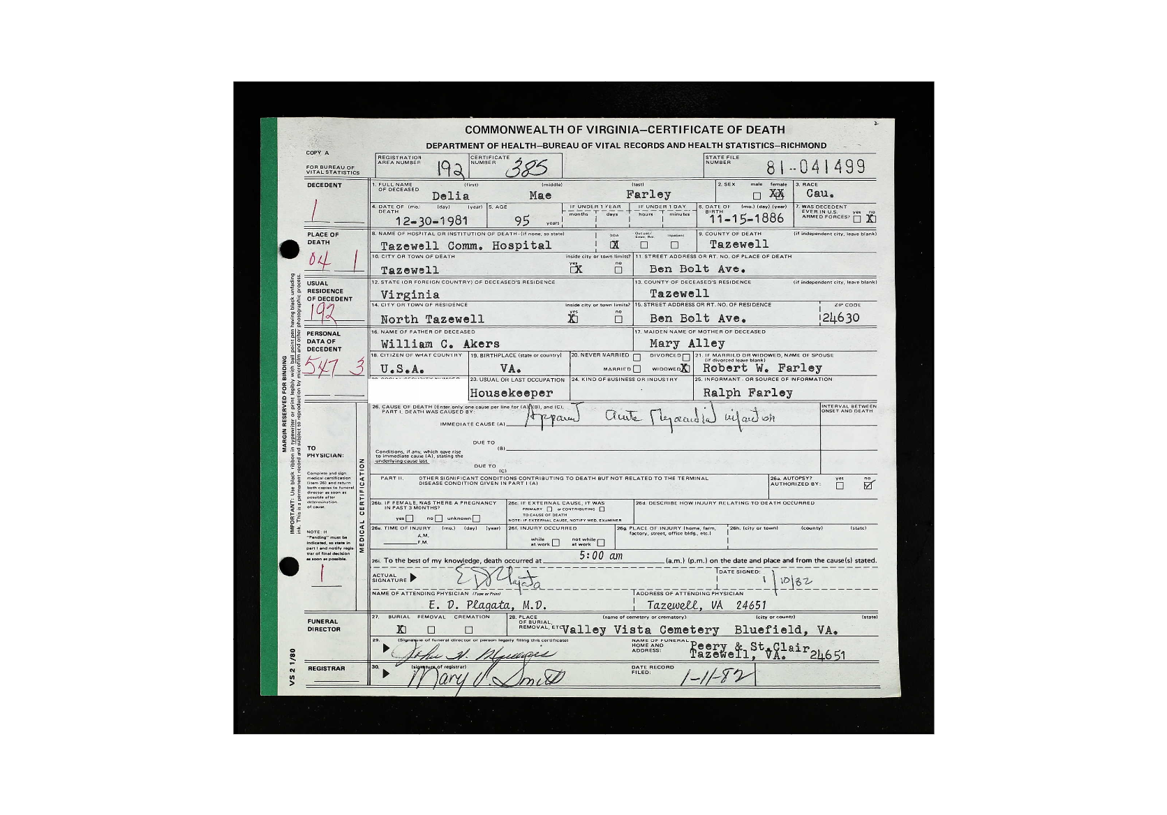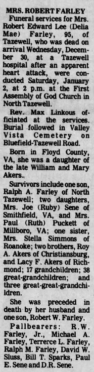 Parents: William Charlton & Mary Jane (Alley) Akers. 1886 Birth: 11-15-1886 Floyd Co., VA. 1890, 1900 Residence: Floyd Co., VA with parents. 1911 Marriage #1: Deliah M. Akers m. Edward L. Farley 5-1-1911 Giles Co., VA. He 23 yo single w/m laborer, b. Summers, s/o Jno. A. & M. She 23 yo single w/f, b. Floyd, d/o Wm & M. J. Robert Edward L. Farley, 1886-1940, s/o John & Menervia (Ford) Farley. 1981 Death: 12-30-1981 of Ben Bolt Ave, North Tazewell, Tazewell Co., VA. [Death Cert]