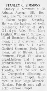 Parents: William Charlton & Mary Jane (Alley) Akers. 1905 Birth: 4-14-1905 Floyd Co., VA. 1910, 1920 Residence: Floyd Co., VA with parents. 1922 Marriage #1: Stella Gladys Akers m. S.C. Simmons 12-20-1922 Alum Ridge, Floyd Co., VA by R. T. Akers, Minister of the Church of the Brethren. He 24 yo single w/m farmer, b. Floyd Co., VA, residence Sowers, VA, s/o R. H. & Sarah Simmons. She 17 yo single w/f, b. Floyd Co., VA, residence Alum Ridge, VA, d/o W. C. & Mary J. Akers. Stanley Crosby Simmons, 1895-1974, s/o Hosea Rufus & Sarah Frances Rebecca (Thompson) Simmons. [Death Cert] [Simmons_JamesW_4wives]