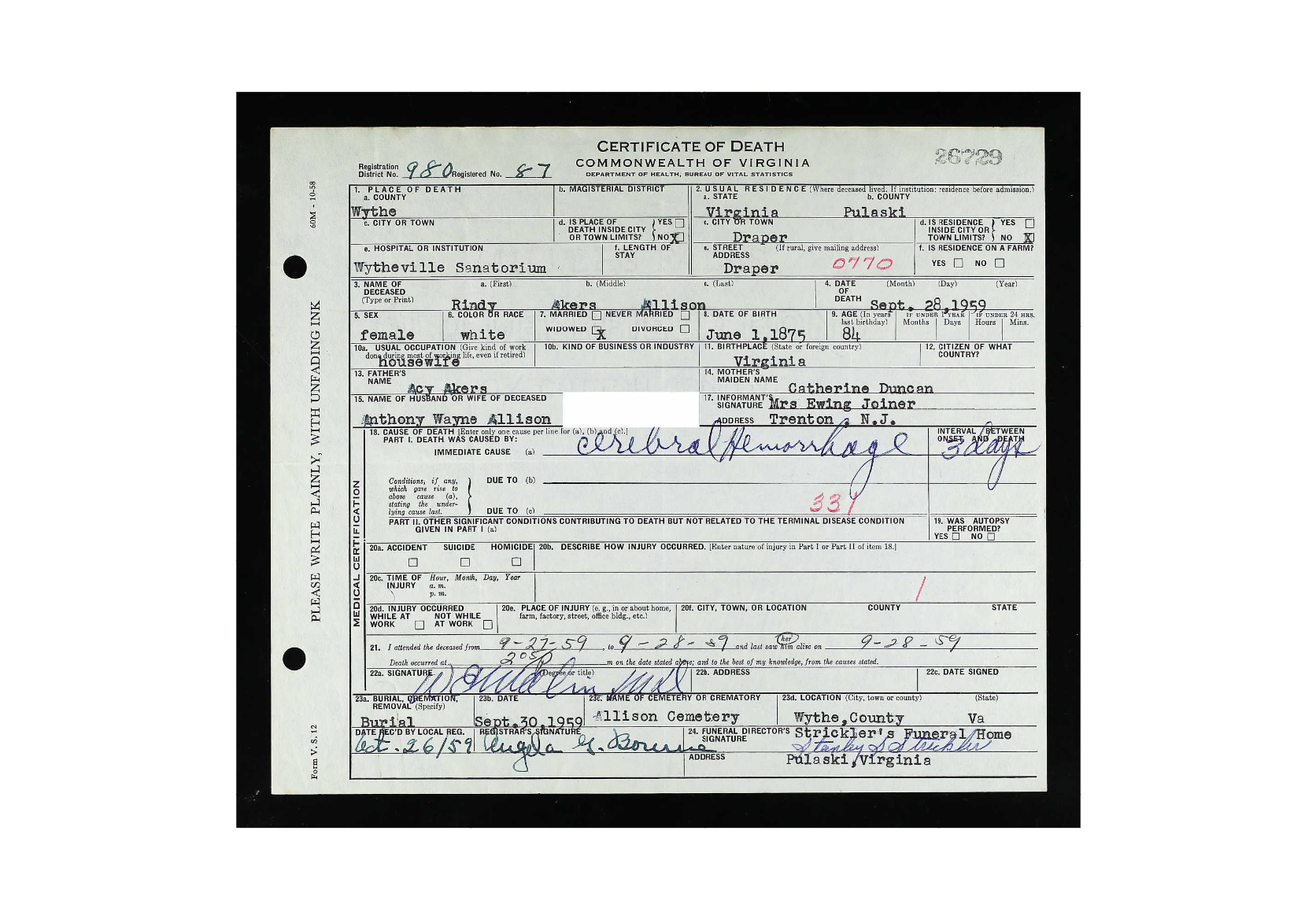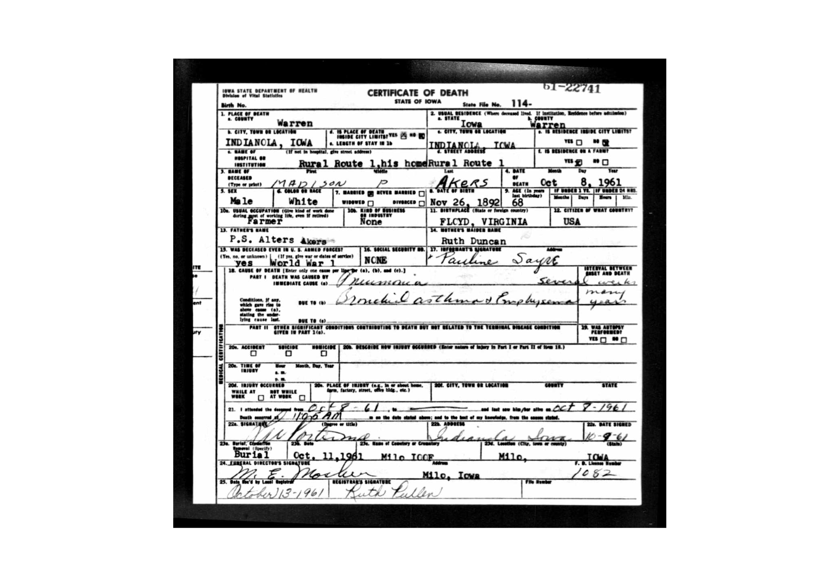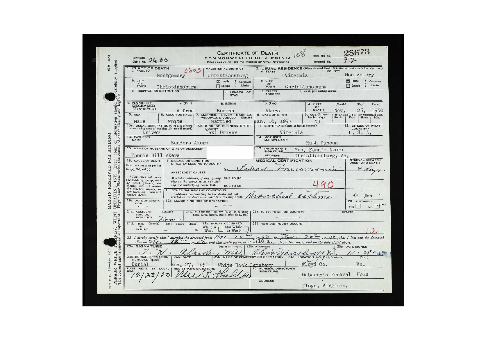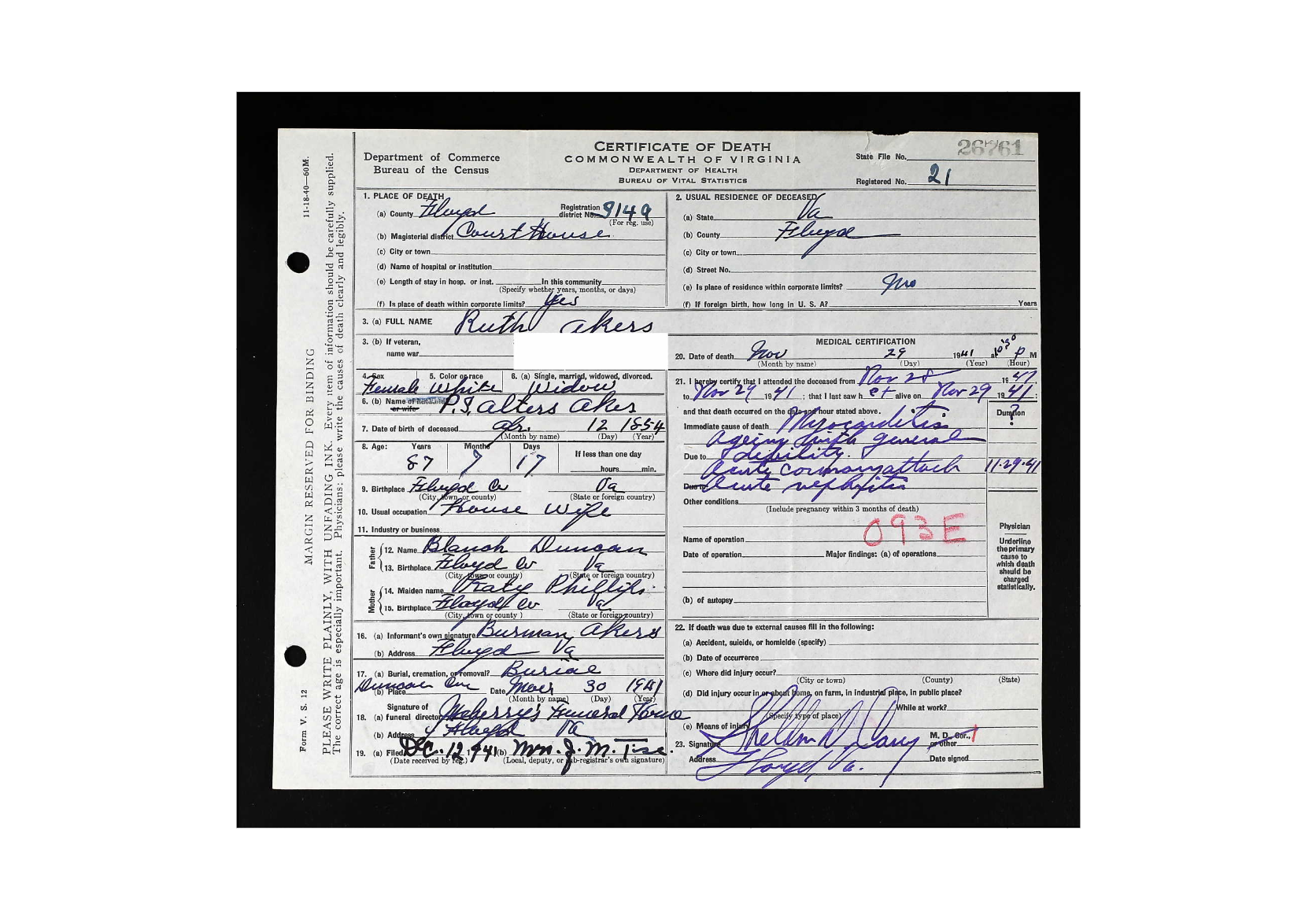 Akers, Woody 14 yo brother in law, b. VA, parents b. VA. 1918 Registration Card: Woodie Isaac Akers, 21 yo single w/m of Carthage, VA, b. May 30, 1897 Floyd Co., VA, nearest relative, Mary Jane Akers of Carthage, VA, his mark witnessed, medium height & build, blue eyes & brown hair, Registered in Hancock Co., IL. 1920: 1922 Marriage #1: Woodie I. Akers m. Toy N. Duncan 3-26-1922 Floyd Co., VA by Willie Dulaney, Minister of the Brethren Church. He 24 yo single w/m farmer, b. Floyd Co., VA, P.O. residence Alum Ridge, VA, s/o Wm C. & Mary J. Akers. She 23 yo single w/f, b. Floyd Co., VA, P.O. residence Carthage, VA, d/o Wm A. & Sabra Duncan. 1930 Residence: Radford City, VA, Melrose District, H374: Akers, Woody I. 32 yo w/m rayon compiler, b. VA, parents b. VA, 24 yo when married, rents, HOH. Toy M. 31 yo wife, b. VA, parents b. VA, 22 yo when married. Clarence W. 7 yo son, b. VA, parents b. VA, school. V. Gertrude 6 yo daughter, b. VA, parents b. VA, school. 1940 Residence: Floyd Co., VA, Indian Valley District 32-9, SR 751, H67: Akers, Woodie 42 yo w/m farm operator, b. VA, completed G5, resided in Roanoke, Roanoke Co., VA 1935, owns HOH. Toya N. 41 yo wife, b. VA, completed G7, resided in Roanoke, Roanoke Co., VA 1935, housework. Woodie C. 17 yo single son, b. VA, completed H3, resided in Roanoke, Roanoke Co., VA 1935, farm laborer. Virginia G. 16 yo daughter, b. VA, completed H2, resided in Roanoke, Roanoke Co., VA 1935, other work. Phyllis Jean 3 yo daughter, b. VA, completed G0. 1967 Death: 4-16-1967 of Floyd Co., VA. [Death Cert] 1967 Burial: Alley Cemetery, 413 Dulaney Rd NW, Floyd Co., VA. (no photo as of Mar 2026) |