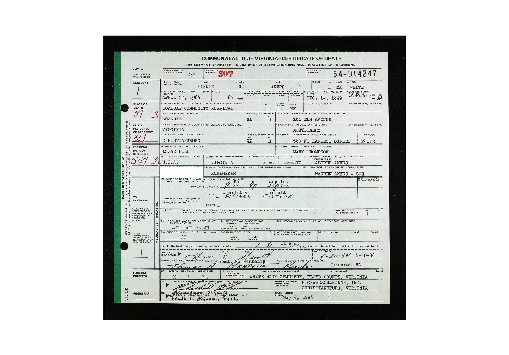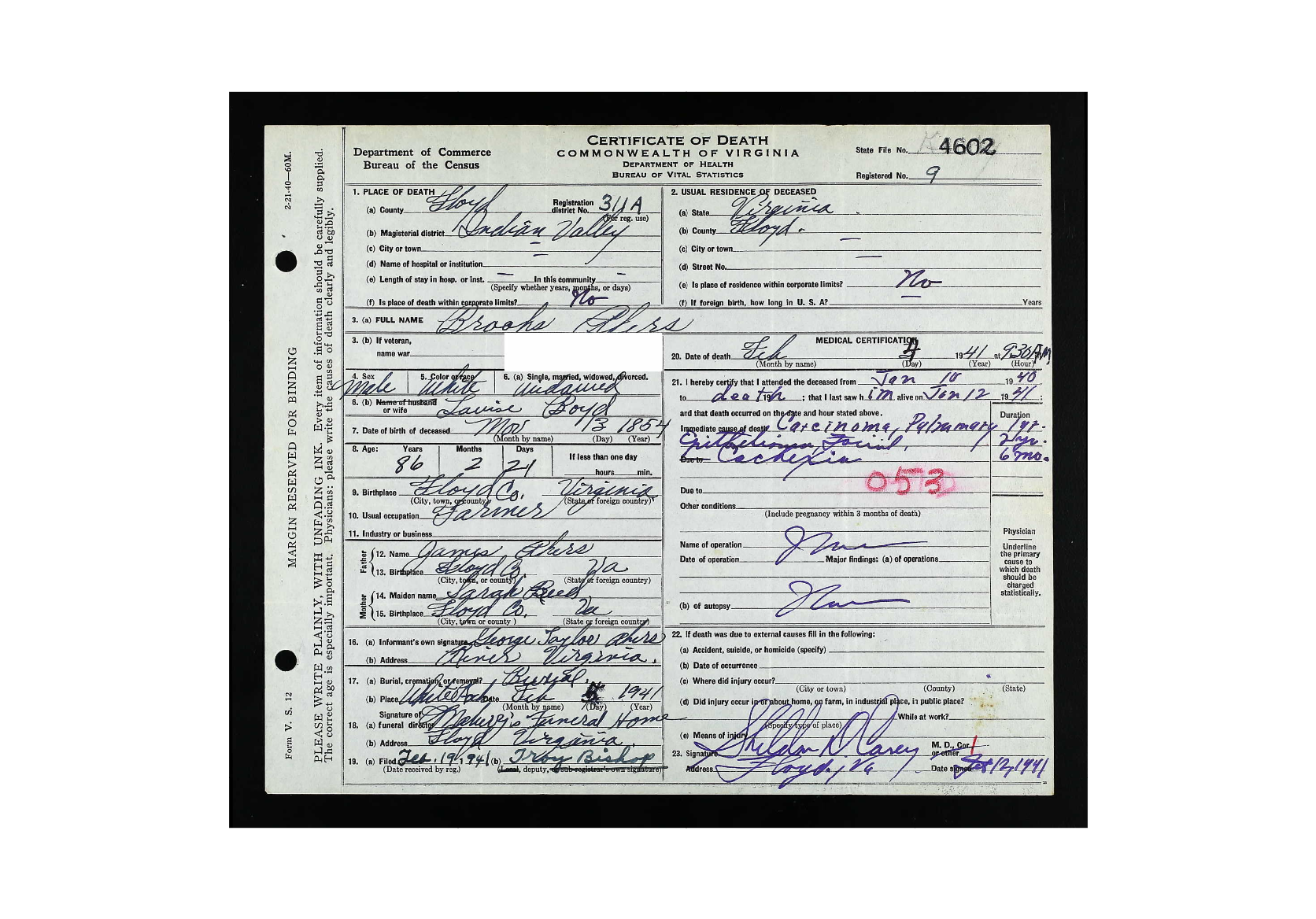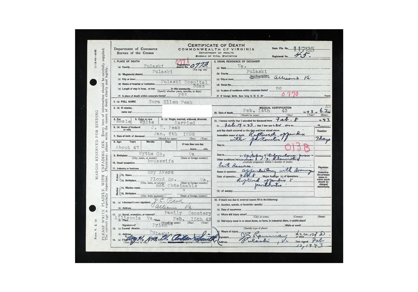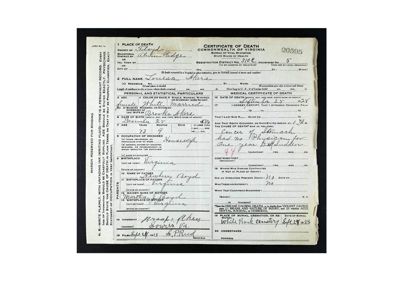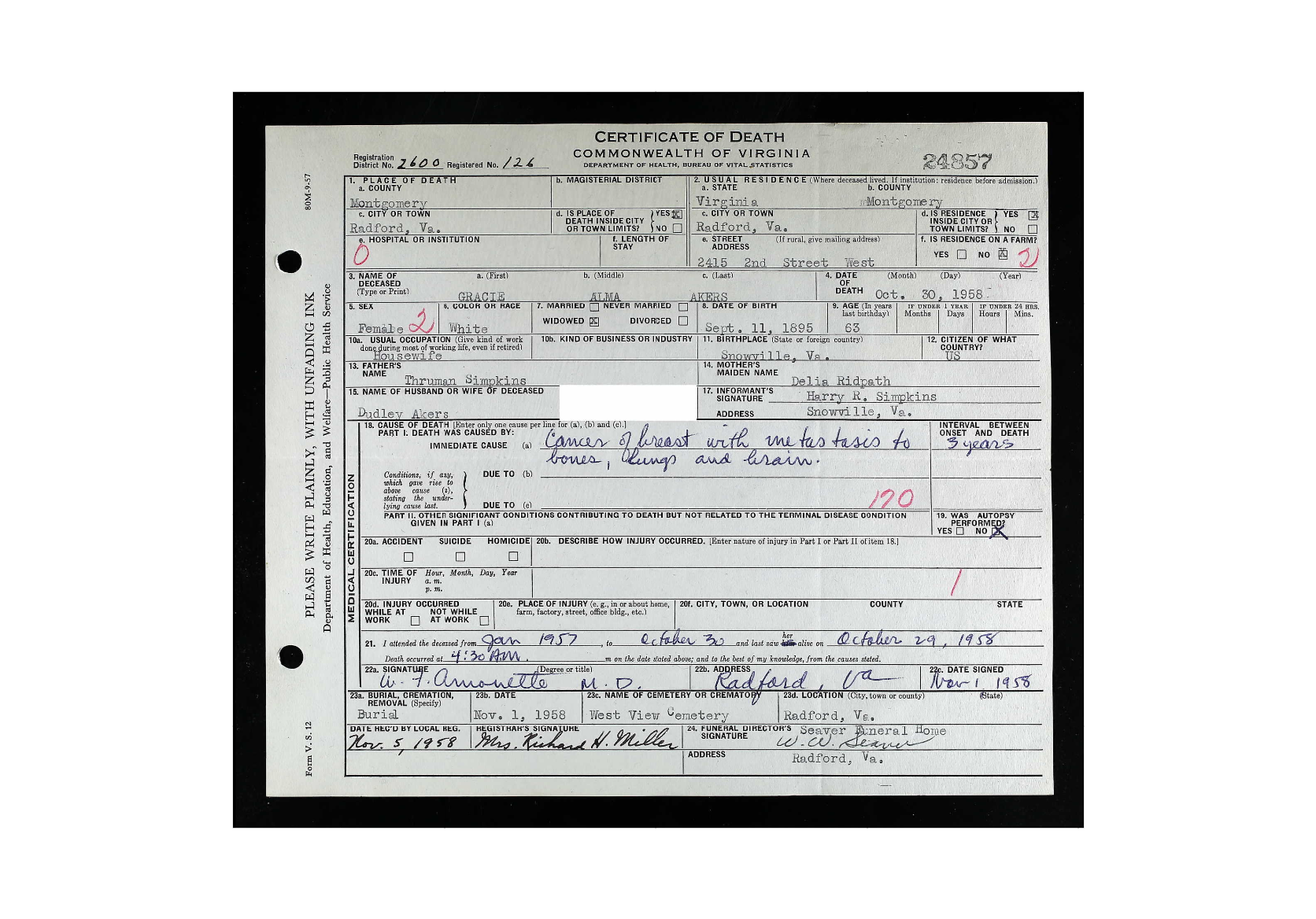 Community Hospital, Radford. VA but of Alum Ridge, Floyd Co., VA. [Death Cert] Sadie