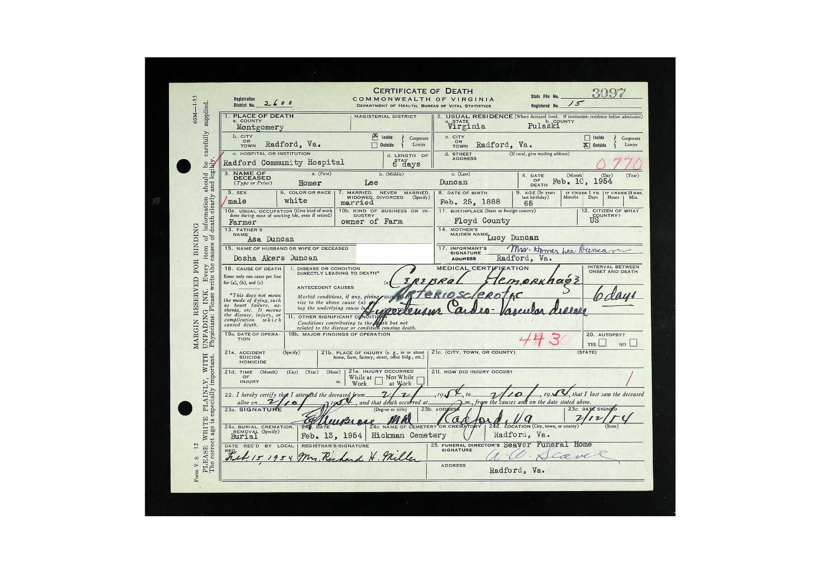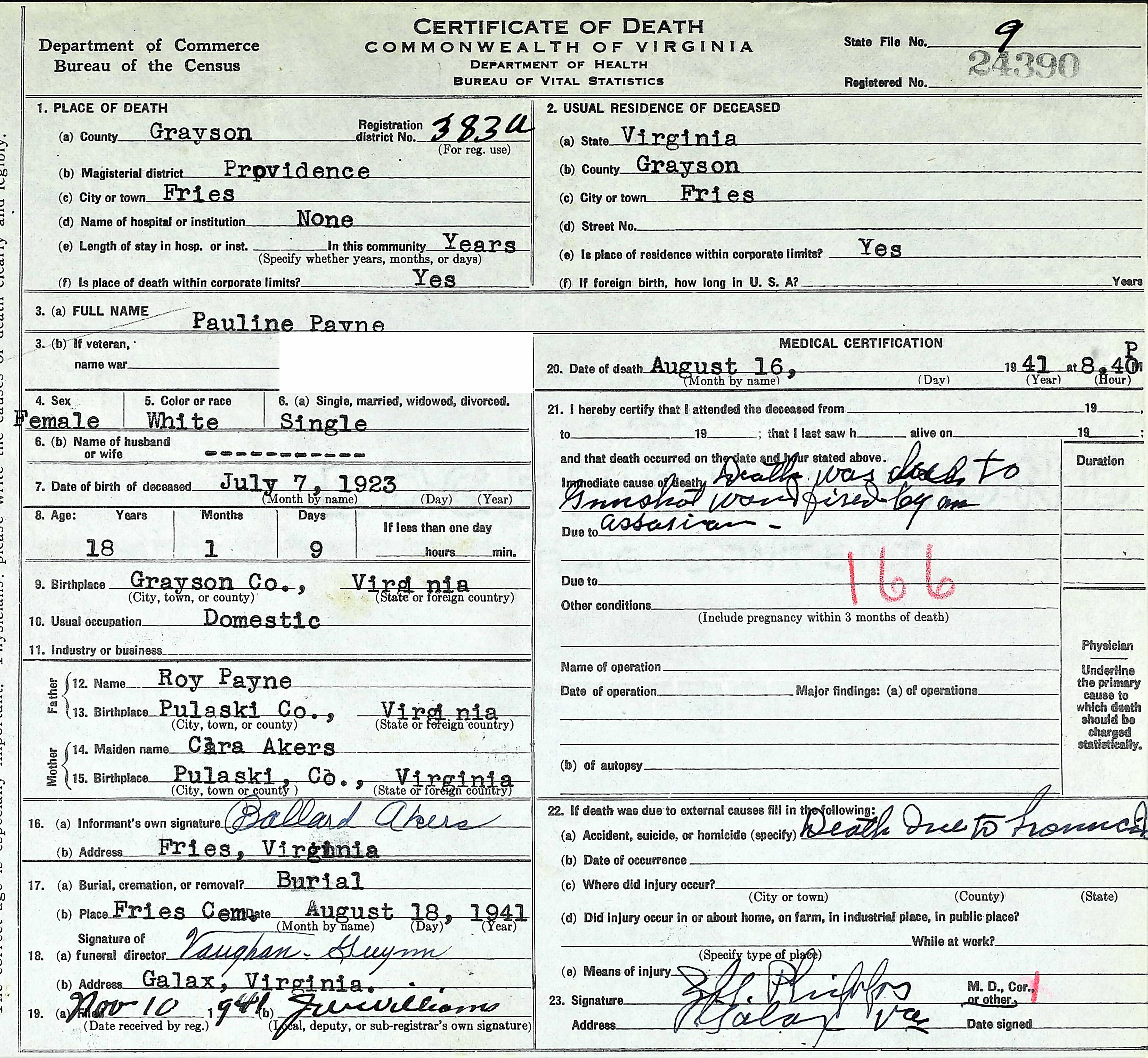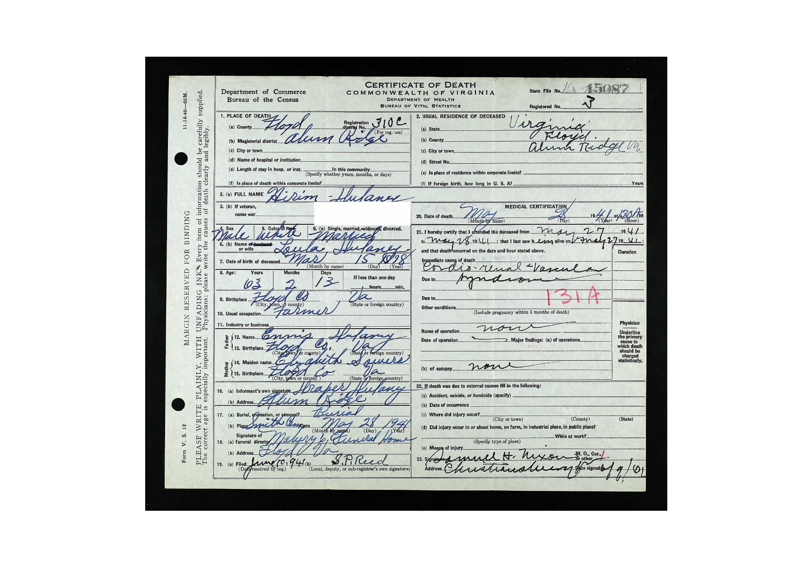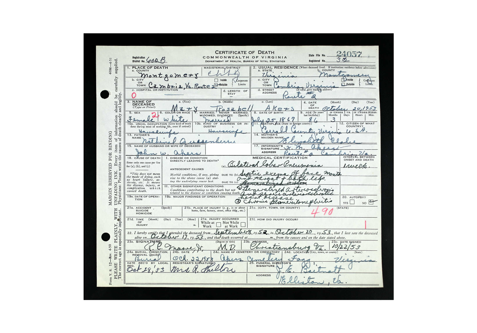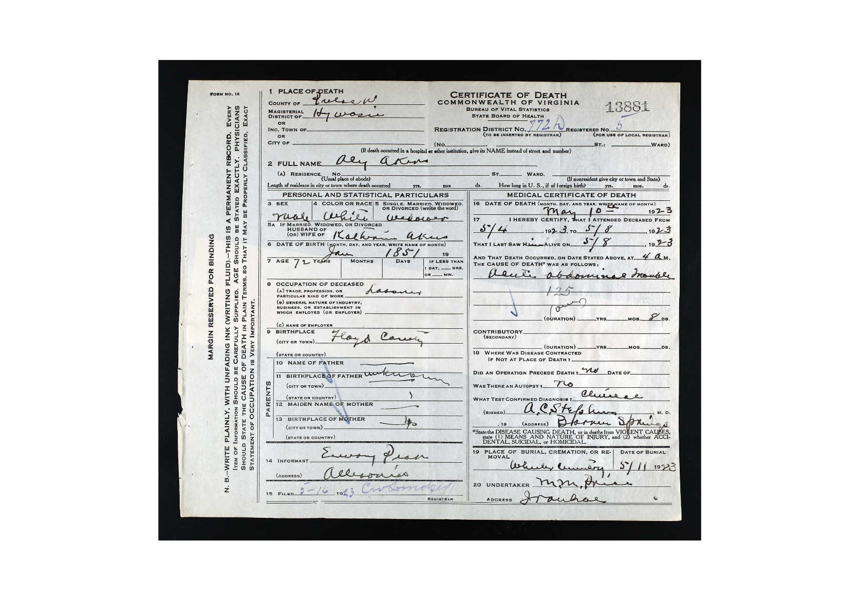 Community Hospital, Radford. VA but of Alum Ridge, Floyd Co., VA. [Death Cert] Sadie