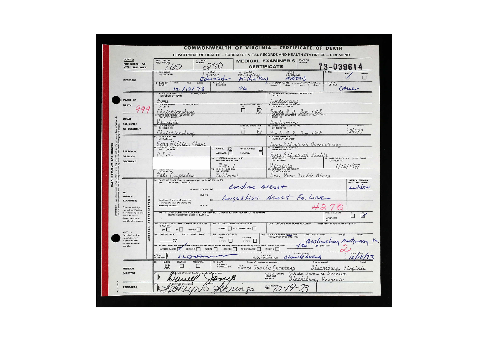The Roanoke Times, Roanoke, Virginia · Saturday, October 20, 1973 1973 Burial: Hickman Cemetery, Radford City, VA.
