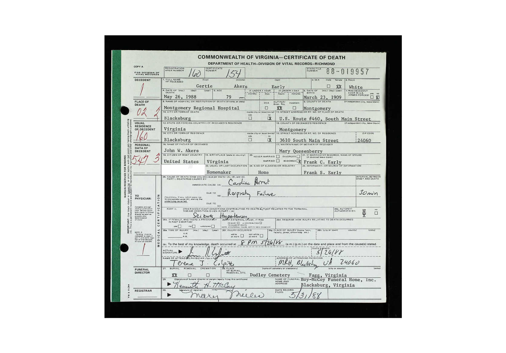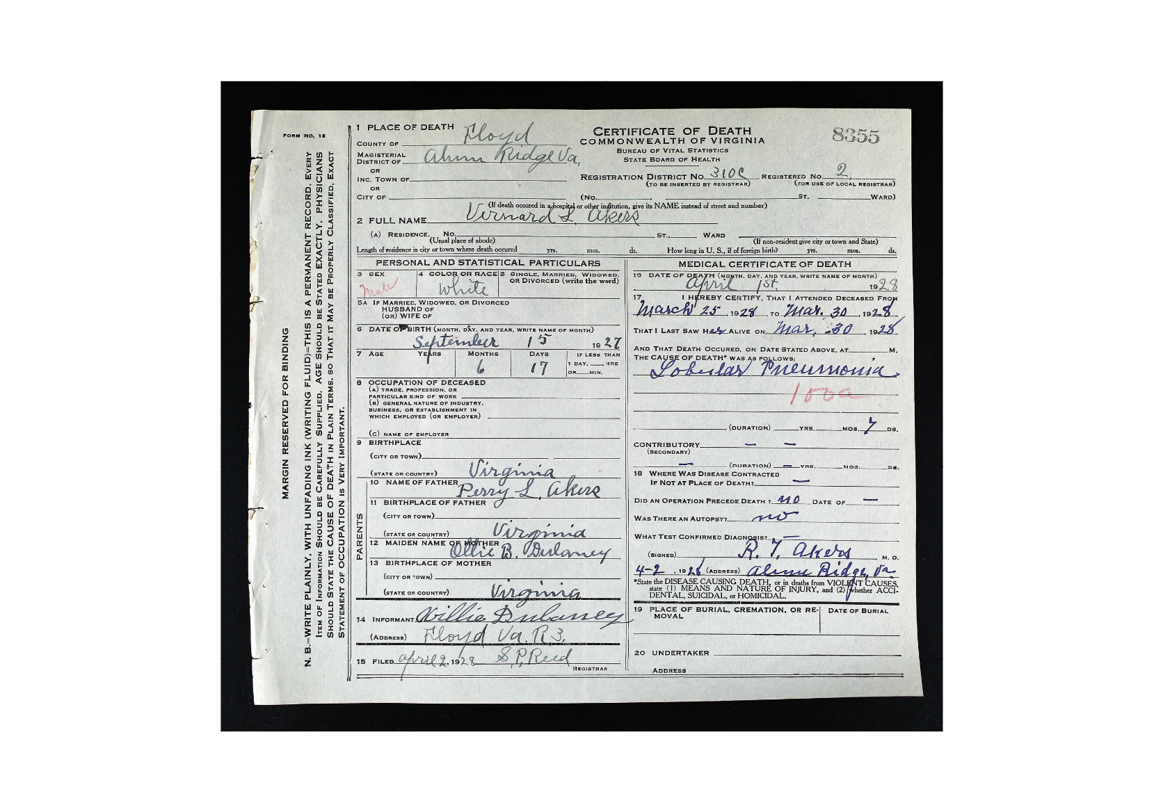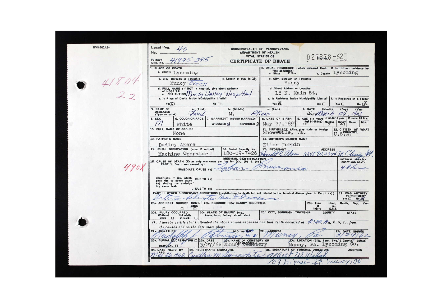Parents: Arteamus Dudley & Sarah Ellen (Turpin) Akers. 1898 Birth: 12-1898 VA. (src: 1900 census) 1898 Birth: 1-2-1898 Floyd Co., VA. (src: delayed birth record but deemed lack of written evidence cannot certify this birth.) 1900, 1910 Residence: Floyd Co., VA with parents. 1920 Residence: Pulaski Co., VA with parents. 1926 Marriage #1: Amie Jane Hill 1-17-1926 Radford, VA. Amie Jane Hill, b. East Radford, VA, 1909-1978, d/o Stokley & Mary C. (Willis) Hill. 1967 Death: 11-28-1967 Muncy, Lycoming Co., Pennsylvania. [PA Death Cert] 1967 Burial: Muncy Cemetery, Muncy, Lycoming Co.,