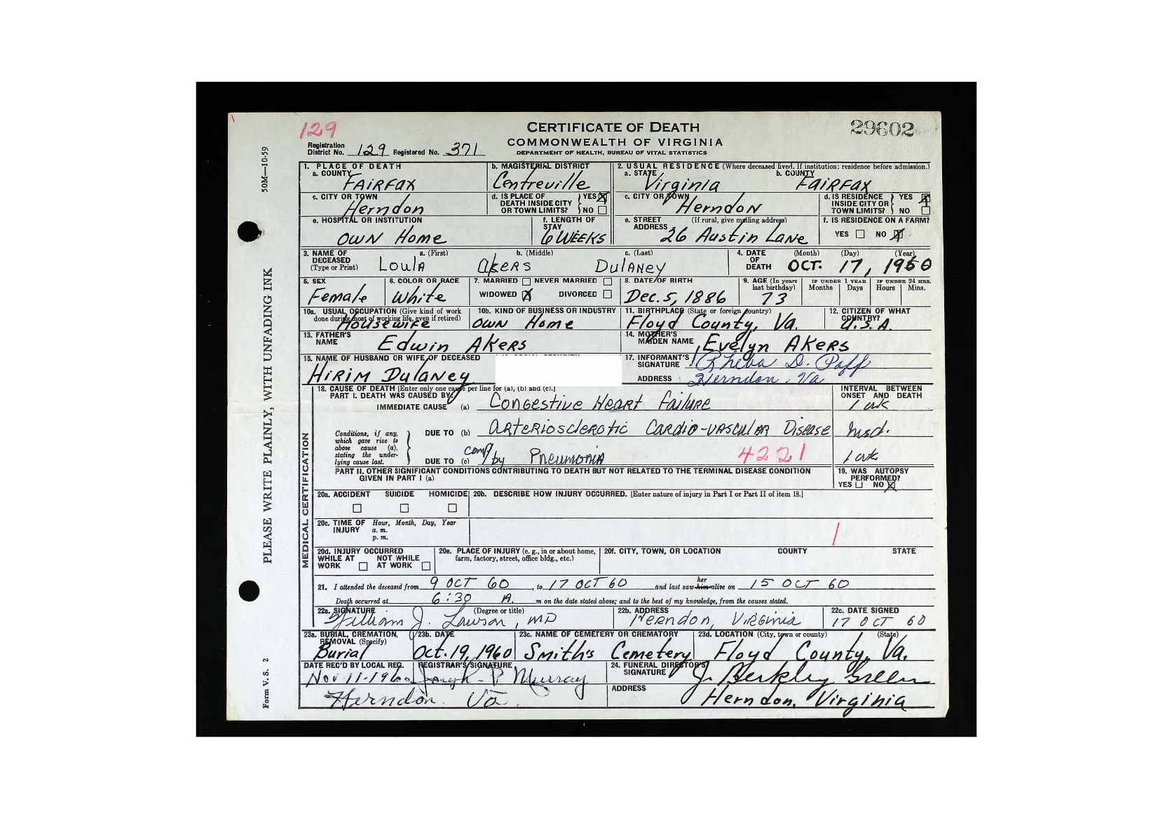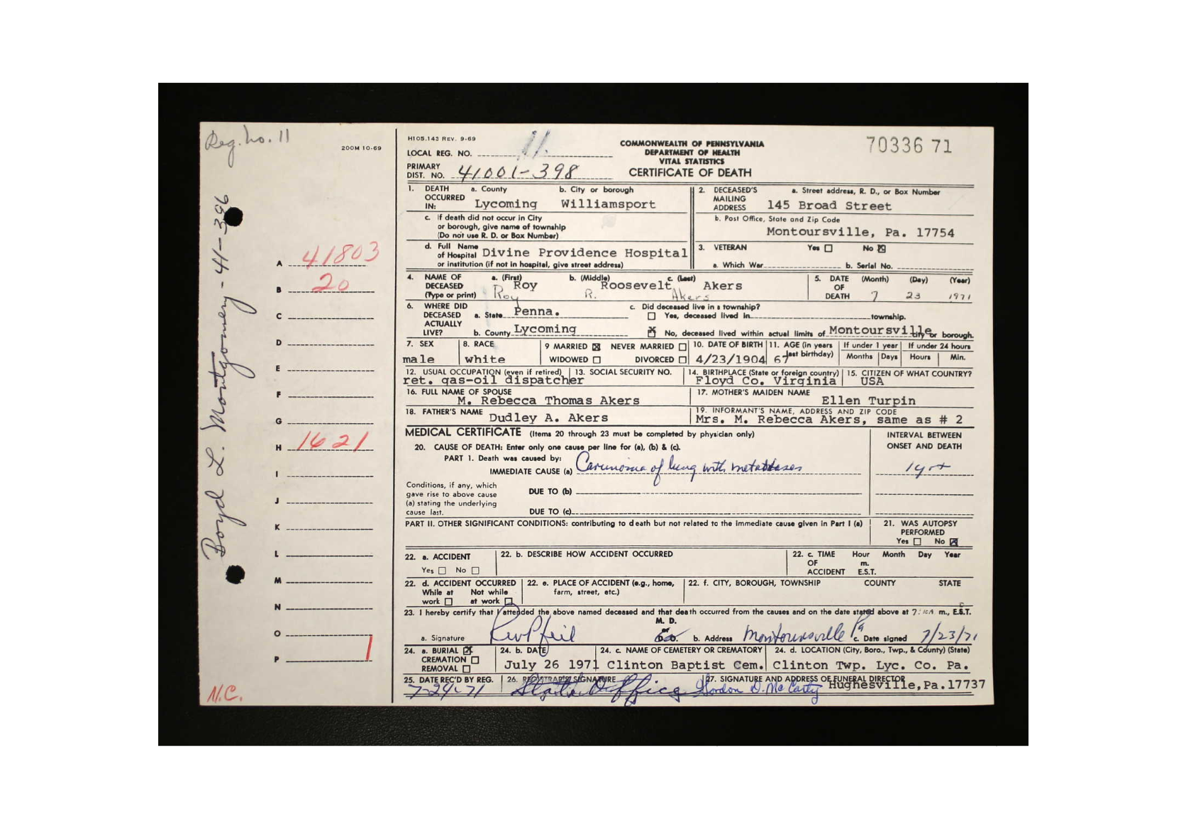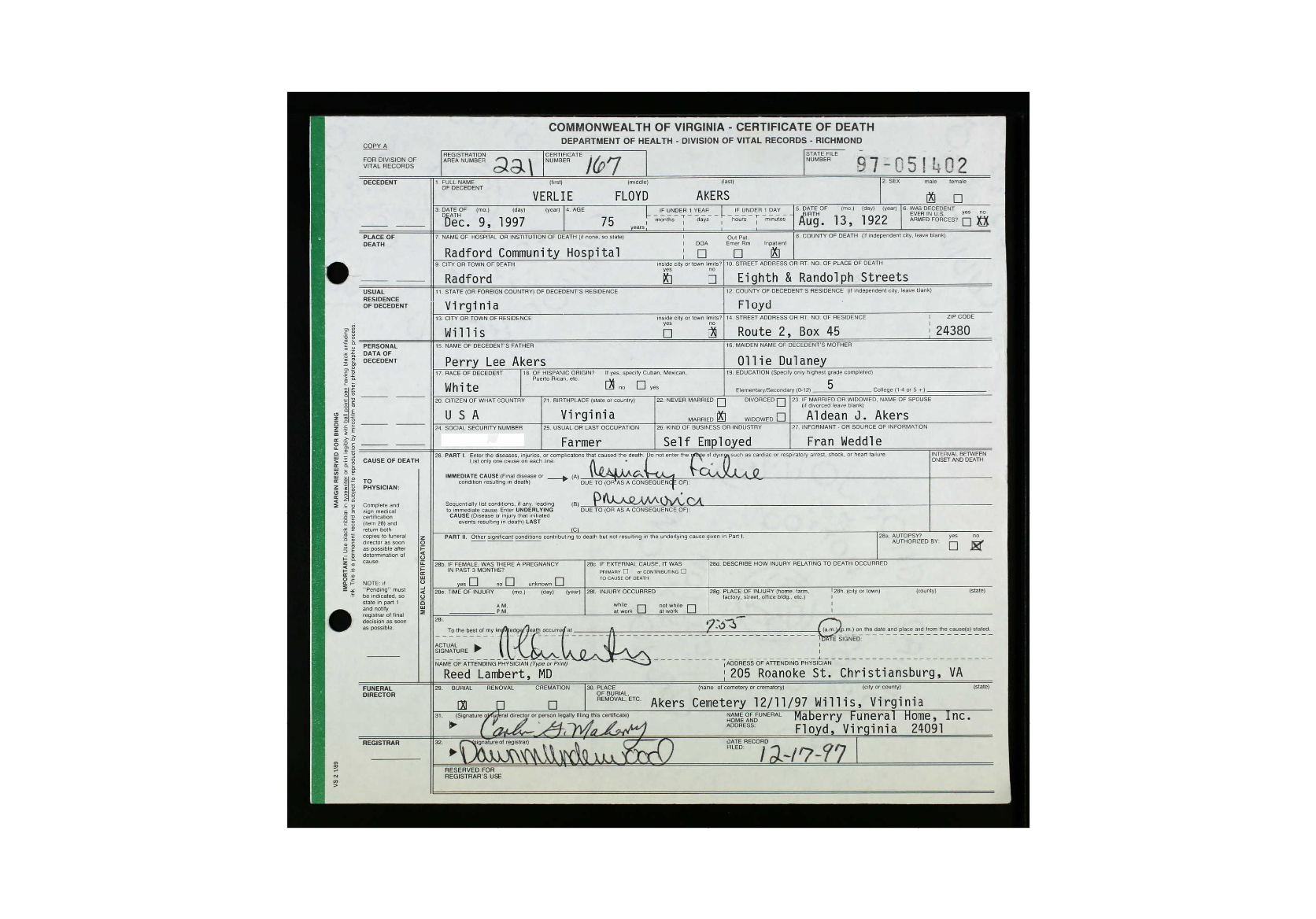 Parents: Arteamus Dudley & Sarah Ellen (Turpin) Akers. 1898 Birth: 12-1898 VA. (src: 1900 census) 1898 Birth: 1-2-1898 Floyd Co., VA. (src: delayed birth record but deemed lack of written evidence cannot certify this birth.) 1900, 1910 Residence: Floyd Co., VA with parents. 1920 Residence: Pulaski Co., VA with parents. 1926 Marriage #1: Amie Jane Hill 1-17-1926 Radford, VA. Amie Jane Hill, b. East Radford, VA, 1909-1978, d/o Stokley & Mary C. (Willis) Hill. 1967 Death: 11-28-1967 Muncy, Lycoming Co., Pennsylvania. [PA Death Cert] 1967 Burial: Muncy Cemetery, Muncy, Lycoming Co.,
