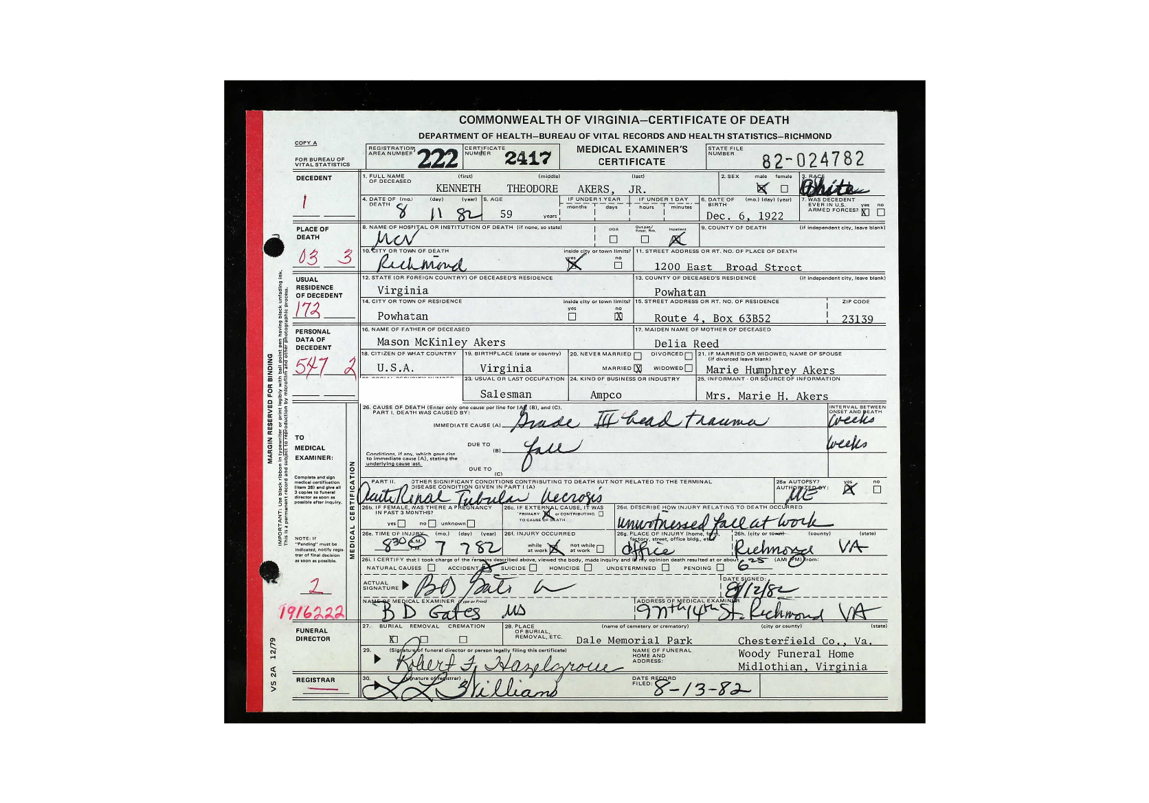 Richmond Times-Dispatch, Richmond, Virginia · Friday, August 13, 1982 1982 Burial: Dale Memorial Park, Chesterfield Co., VA.