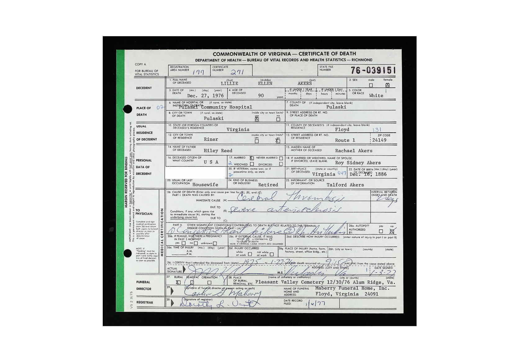 Parents: William Charlton & Mary Jane (Alley) Akers. 1907 Birth: 10-5-1907 Carthage, Floyd Co., VA. 1910, 1920 Residence: Floyd Co., VA