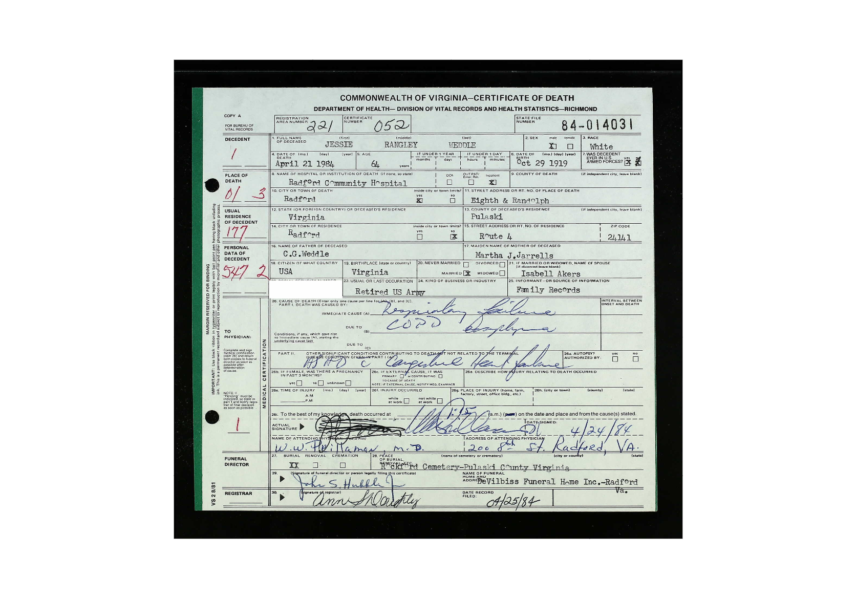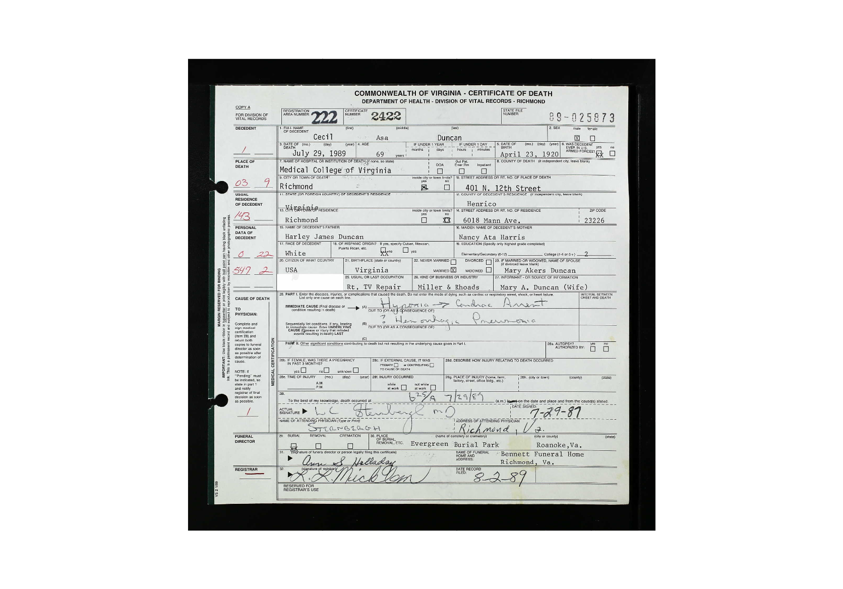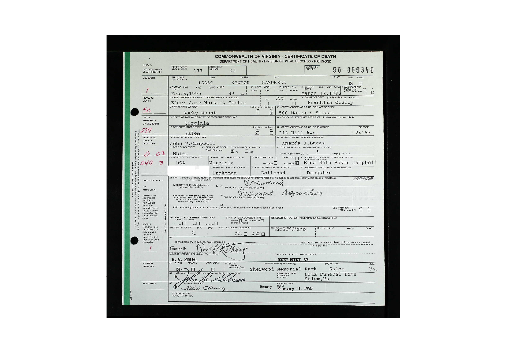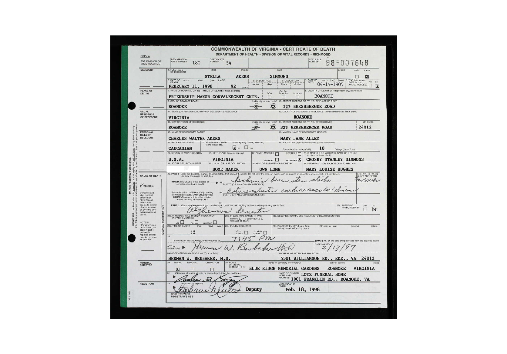 Virginia · Monday, April 08, 1974 1998 Death: 2-11-1998 Roanoke, VA. [Death Cert]