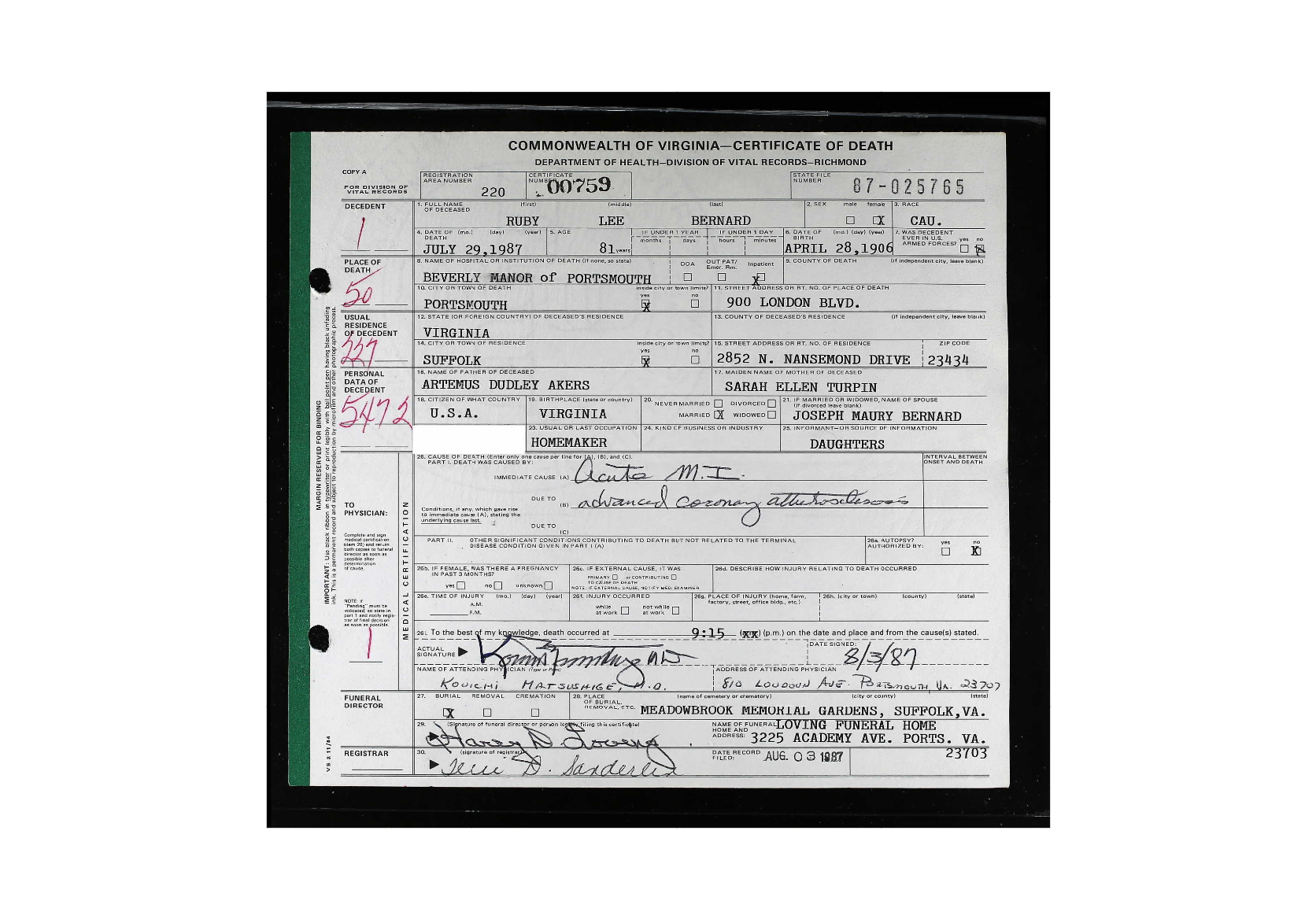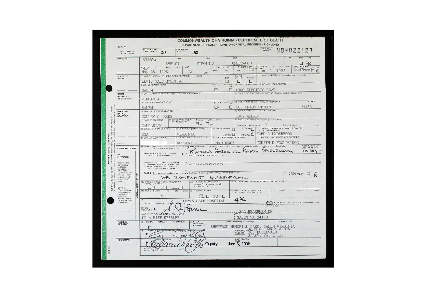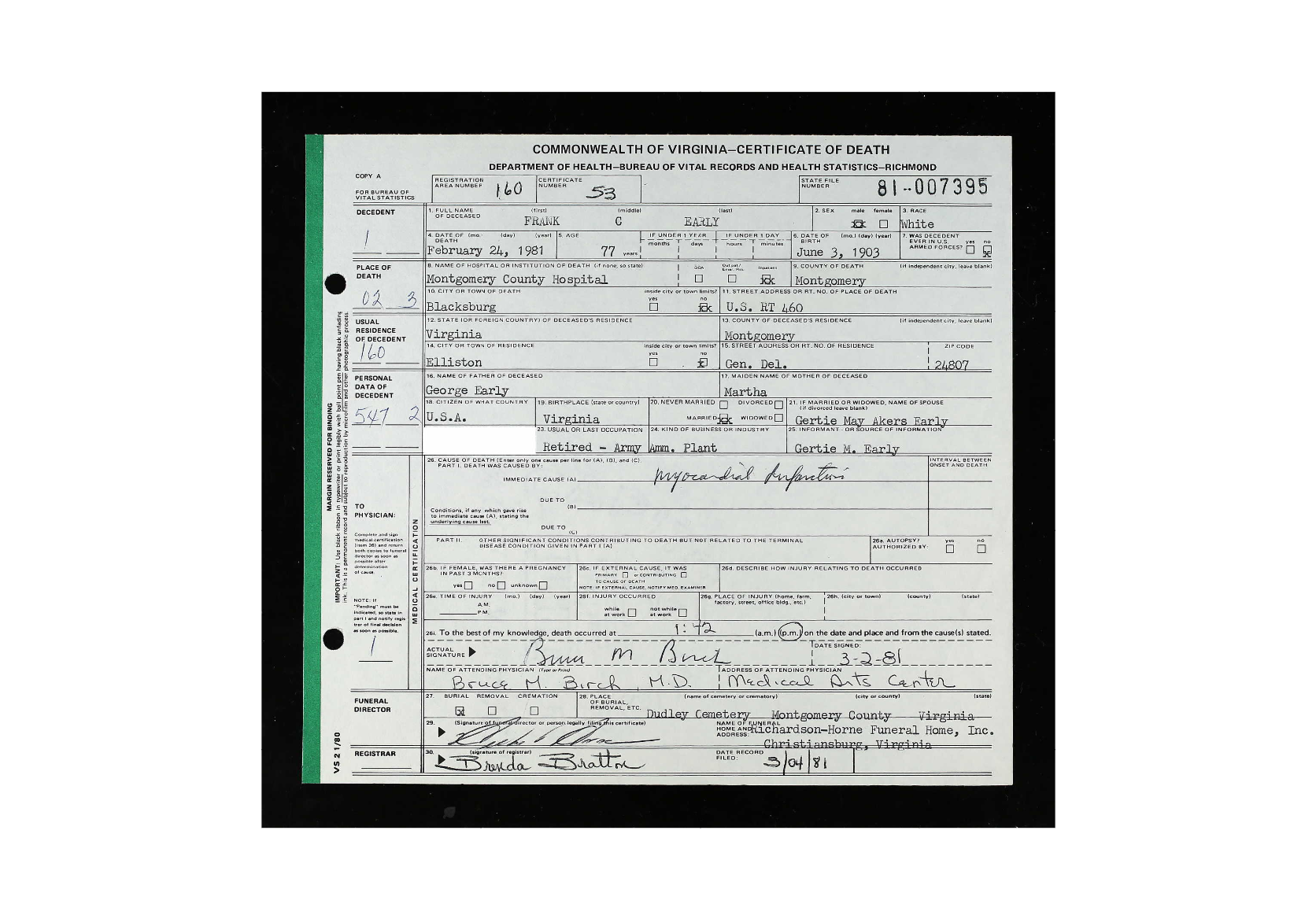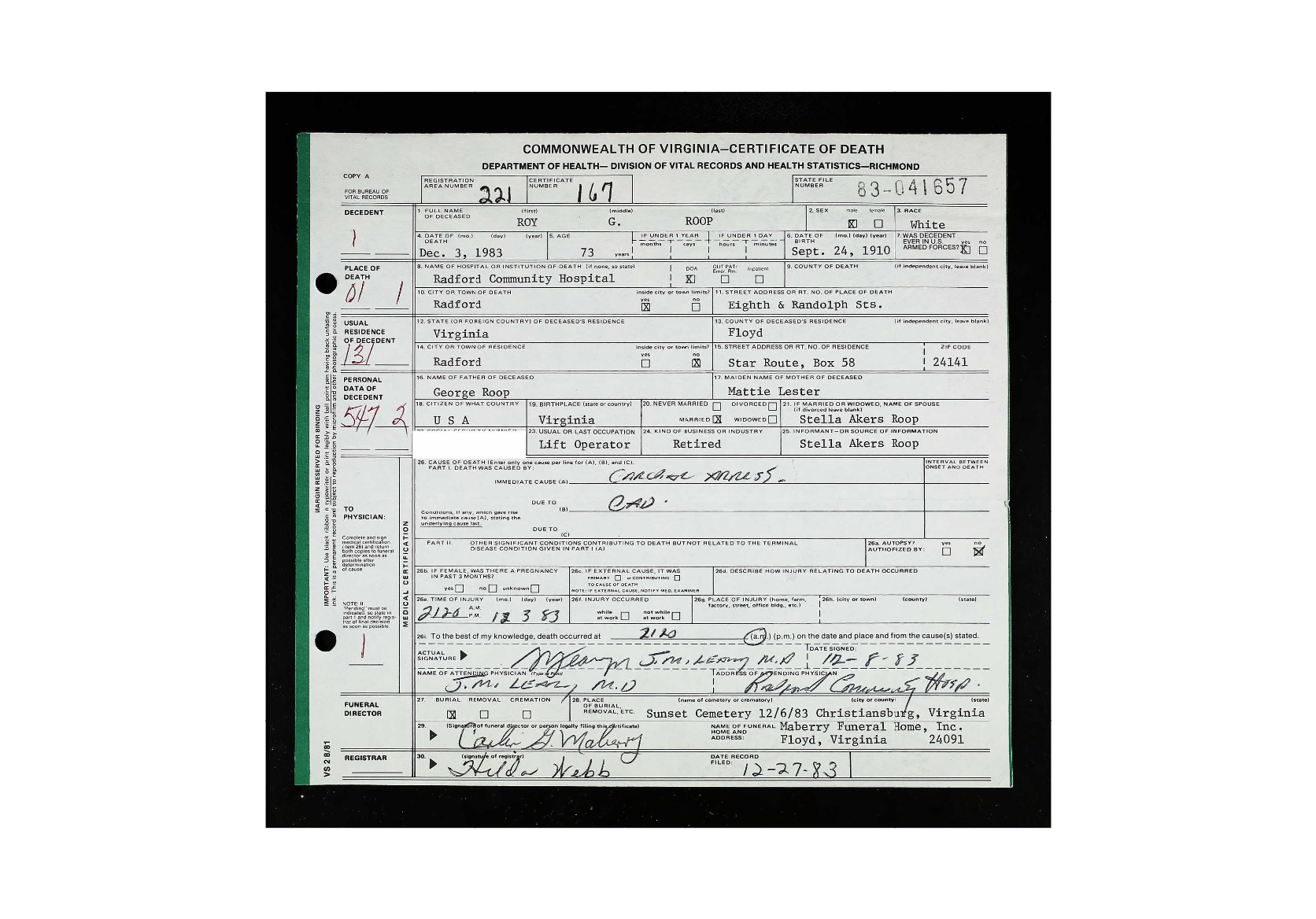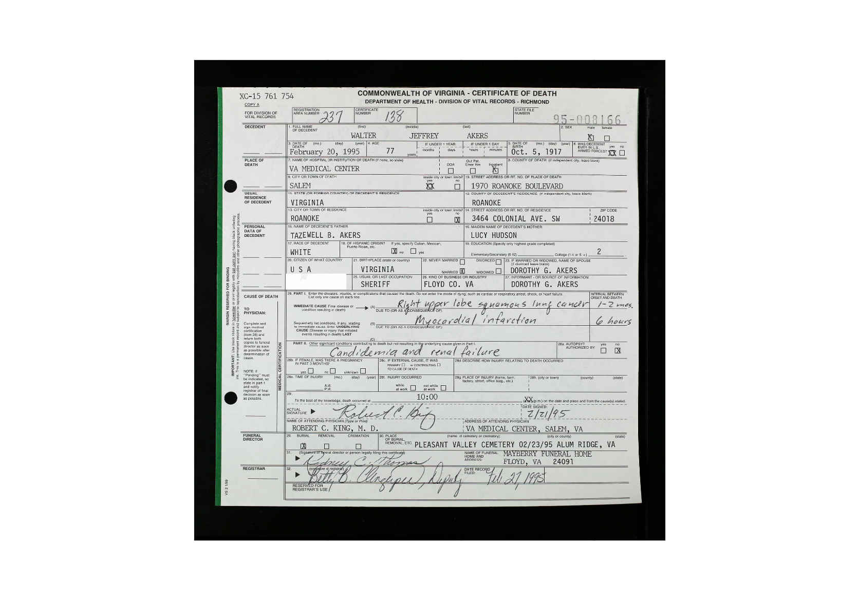 Virginia · Monday, April 08, 1974 1998 Death: 2-11-1998 Roanoke, VA. [Death Cert]