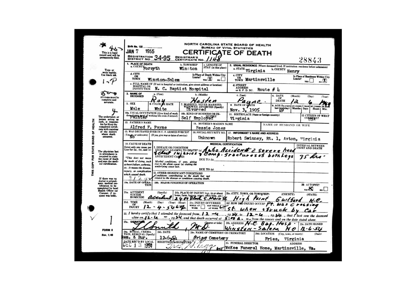 Aug 12, 1947 1947 Burial: Hickman Cemetery, Radford City, VA.