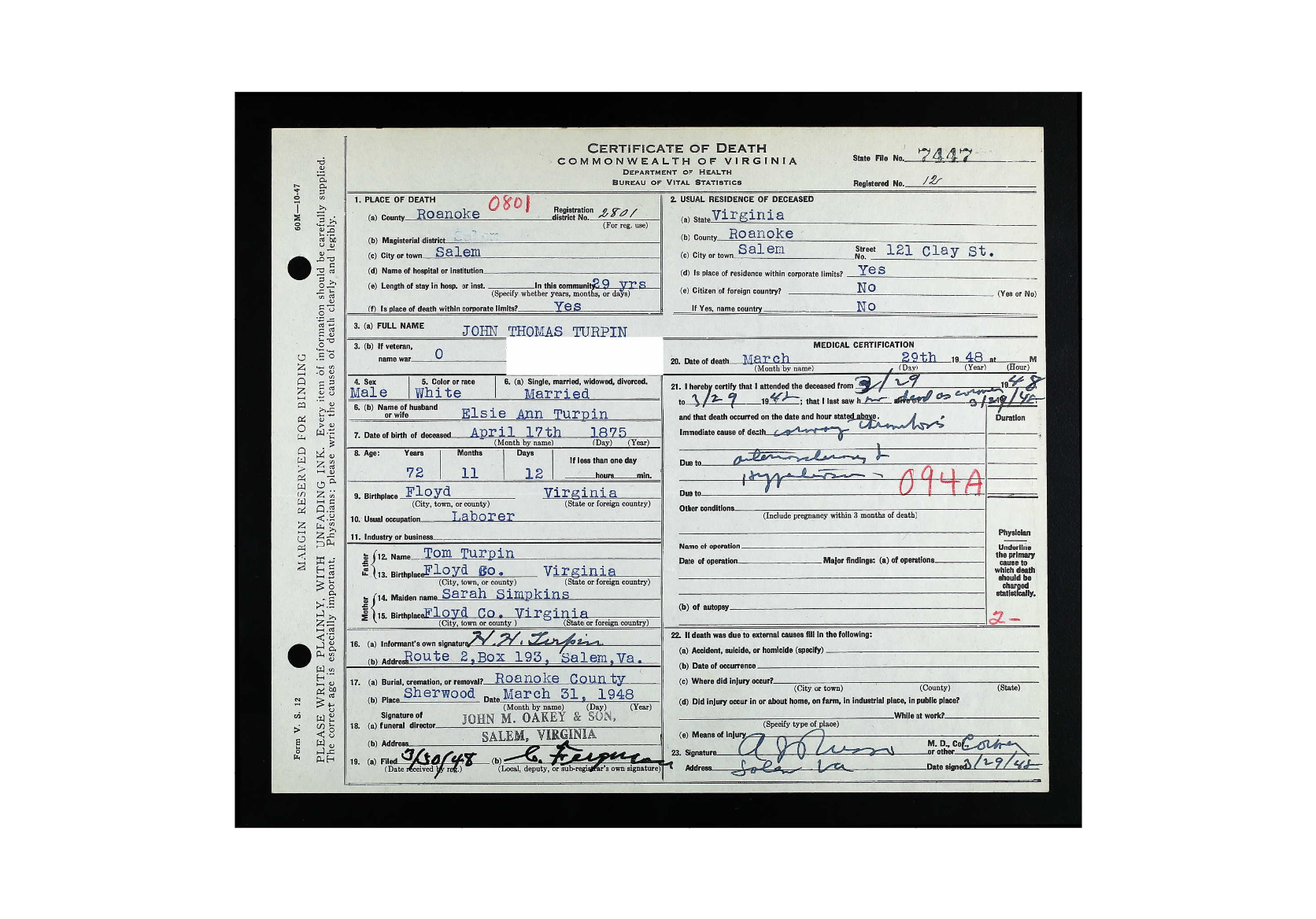 Parents: Thomas & Sarah (Simpkins) Turpin. [no file] 1865 Birth: 1865 Floyd Co., VA. (src: YOB tombstone; POB: marriage record) 1867 Birth: 12-14-1867 Pulaski Co., VA. (src: death record) 1870 Birth: Dec 1870 Floyd Co., VA. (src: 1900 census; POB: marriage record) 1900, 1910 Residence: Floyd Co., VA