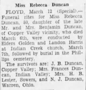 Parents: William Ira Columbus & Mattie Florence (Young) Duncan. 1911 Birth: 4-20-1911 VA. 1920, 1930 Residence: Floyd Co., VA with parents. 1927 Marriage #1: Ruby m. Preston B. Duncan 1927 Floyd Co., VA. Preston Ballard Duncan, 1906-1966, s/o Everett Cornelius & Mary Elizabeth “Betsy” (Turman) Duncan. [duncan3] 1981 Death: 8-13-1981. 1981 Obit: THE NEWS JOURNAL, RADFORD, FRI, Aug 14, 1981 (src: Find A Grave) Ruby D. Duncan, 70, died