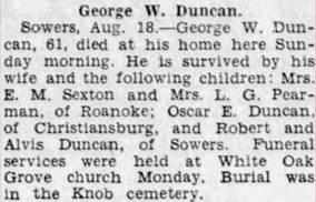 The Roanoke Times, Roanoke, Virginia · Thursday, October 10, 1946 1946 Burial: White Oak Grove Cemetery, White Oak