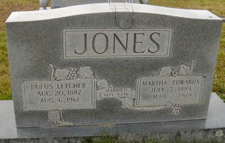 Parents: Jesse & Julia Ann (Epperly) Edwards. 1883 Birth: 7-2-1883 Floyd Co., VA. (src: birth record) 1884 Birth: July 1884 VA. (src: 1900 census) 1885 Birth: 7-7-1885. (src: tombstone) 1890, 1900 Residence: Floyd Co., VA with parents. 1911 Marriage #1: Rufus L. Jones m. Martha E. Edwards 11-9-1911 Floyd Co., VA by I. N. Munsey, Minister of the Methodist Episcopal Church. He 23 yo single w/m farmer, b. Floyd Co., VA, residence Montgomery Co., VA, s/o W. B. & Mary E. Edwards. She 24 yo single w/f, b. & living in Floyd Co., VA, d/o Jesse & Julia Edwards. Rufus Letcher Jones, s/o William Beverley & 2nd wife Mary E. (Sowers) Jones. [jones] 1969 Death: 3-7-1969. 1969 Burial: Sunset Cemetery, Christiansburg, Montgomery Co., VA.