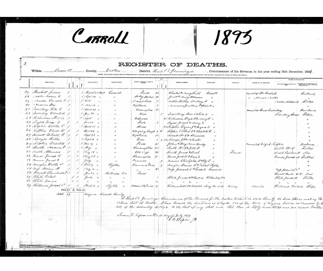s/o Wesley & Polly Smith. She 17 yo single w/f, b. Carroll Co., VA, d/o