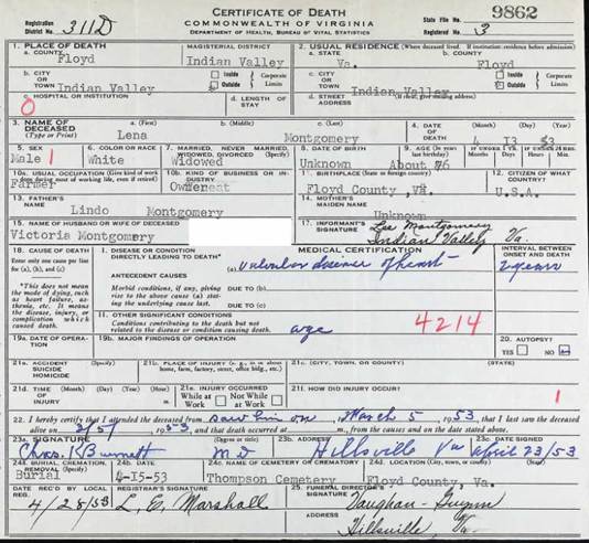Parents: Iredell Olando & 1st wife Corrilda (Phillips) Montgomery. 1877 Birth: abt 1877 VA. 1880 Residence: Floyd Co., VA with parents. 1890 Residence: Floyd Co., VA with father & stepmother. 1898 Marriage #1: Linney Montgomery m. Victoria Phillips 10-24-1898 Carroll Co., VA. He 21 yo single w/m, b. Floyd Co., VA, s/o I. L. & Corrilda. She 16 yo single w/f, b. Carroll Co., VA, d/o B. P. & Amanda Phillips. 1900 Residence: Floyd Co., VA, Indian Valley District 15, H140: ...... Montgomery, Lenney 21 yo w/m farm laborer, b. 1879 VA, , parents b. VA, m. 1y cannot read or write, owns farm, HOH. ............ Victoria 30 yo wife, b. VA, parents b. VA, m11y, 4 childre with 4 living, cannot read or write. ............ Baby 11/12 son, b. July 1899 VA, parents b. VA. 1910 Residence: Floyd Co., VA, Indian Valley District 48, H66: ...... Montgomery, Ira M. 33 yo w/m farmer, b. VA, parents b. VA, m. 11y, cannot read or write, rents house, HOH. ............ Victoria 17 yo wife, b. 1883 VA, parents b. VA, m1y, 1 child with 1 living, cannot read or write. ............ Frank J. 10 yo son, b. VA, parents b. VA, school. ............ Norma E. 8 yo daughter, b. VA, parents b. VA. ............ Evaline 5 yo daughter, b. VA, parents b. VA. ............ Jennie 2 yo daughter, b. VA, parents b. VA. 1918 Registration Card: 9-12-1918 Southwestern State Hospital, Marion, Smyth Co., VA. Lennie Montgomery, 37 yo w/m patient of Indian Valley, Floyd Co., VA, b. May 12, 1881. Nearest Relative: Victoria Montgomery, Mother(?), of Indian Valley, Floyd Co., VA. Medium height & build, brown eyes & hair. Insane. 1920: 1930 Residence: Southwestern State Hospital, Marion, Smyth Co., VA: ............ Montgomery, Lennie 52 yo married w/m laborer, b. VA, parents b. VA, 21 yo when 1st married. 1940 Residence: Floyd Co., VA, Indian Valley District 32-10, SR 613, H159: ...... Montgomery, Lennie 62 yo married w/m farm operator, b. VA, completed G4, resided in same house 1935, owns, HOH. 1953 Death: 4-13-1953 Indian Valley, Floyd Co., VA.