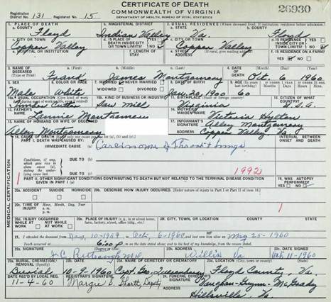 Parents: Landon Iredel “Lennie” & Victoria (Phillips) Montgomery. 1899 Birth: July 1899 VA. 1900 Birth: 1-20-1900 Floyd Co., VA. (src: delayed birth record; tombstone) 1900, 1910 Residence: Floyd Co., VA with parents. 1920 Marriage #1: Allie Elizabeth Phillips. 1930 1940 Residence: Anawalt, McDowell Co., VA, Adkin District 42-11, H78: ...... Montgomery, Frank 42 yo w/m timber contractor, b. VA, completed G6, resided in same place 1935, HOH. ............ Allie 38 yo wife, b. VA, completed G6, resided in same place 1935, timber helper. ............ Earnie 17 yo single son, b. VA, completed G6, resided in same place 1935, new worker. ............ Bessie 15 yo daughter, b. VA, completed G6, resided in same place 1935, school. ............ Rosa 12 yo daughter, b. WVA, completed G4, resided in same place 1935, school. ............ Sylvia 9 yo daughter, b. VA, completed G3, resided in same place 1935, school. ............ Carlos 7 yo son, b. VA, completed G2, resided in same place 1935. ............ Willie 4 yo son, b. WVA, completed G0. ............ Loraine 2 yo daughter, b. WVA, completed G0. 1960 Death: 10-6-1960 Copper Valley, Floyd Co., VA.
