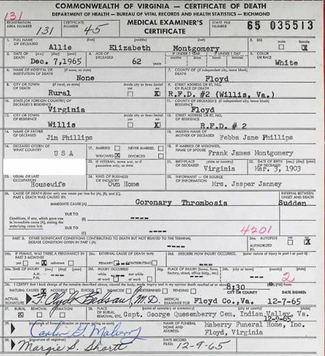 Parents: James Ellis & Phoebe Jane (Phillips) Phillips. [no file] James Ellis Phillips s/o Thomas Jefferson & Sarah Jane (Cooper) Phillips of Carroll Co., VA. [no file] Phoebe Jane Phillips d/o Bryant & Alley Adeline (Phillips) Phillips. [Phillips_Randolph_2wives] 1903 Birth: 3-3-1903 Indian Valley, Floyd Co., VA. 1930 1940 Residence: Anawalt, McDowell Co., VA with husband Frank James Montgomery. 1956 Death: 12-7-1965 R.F.D. #2 Willis, Floyd Co., VA.