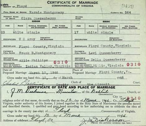 Parents: Frank James & Allie Elizabeth (Phillips) Montgomery. 1922 Birth: 9-22-1922 Floyd Co., VA. 1930 1940 Residence: Anawalt, McDowell Co., VA with parents. 1946 Marriage #1: Earnie Montgomery m. Clara Quesenberry 3-12-1946 Floyd Co., VA.