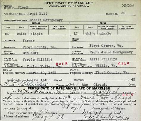 Parents: Frank James & Allie Elizabeth (Phillips) Montgomery. 1925 Birth: abt 1925 VA. 1930 1940 Residence: Anawalt, McDowell Co., VA with parents. 1942 Marriage #1: Bessie Montgomery m. Argel Huff 3-10-1942 Floyd Co., VA. Argel Dewey Huff, 1921-1974, s/o John Daniel & Vercie Lillie (Phillips) Huff. [no file] John Daniel Huff s/o John Wesley & 1st wife Eunice Irene (Marshall) Huff of Carroll Co., VA. [no file] Lillie Vercie (Phillips) Huff d/o John Henry & Millie Jane (Phillips) Phillips. [Phillips_Randolph_2wives]