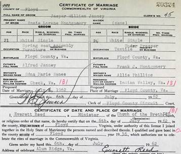 Parents: Frank James & Allie Elizabeth (Phillips) Montgomery. 1938 Birth: 2-25-1938 Anawalt, McDowell Co., VA. 1940 Residence: Anawalt, McDowell Co., VA with parents. 1962 Marriage #1: Annie m. Jasper William Janney 7-6-1962 Floyd Co., VA.