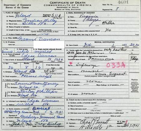 Parents: Landon Iredel “Lennie” & Victoria (Phillips) Montgomery. 1902 Birth: 1902 VA. 1910, 1920 Residence: Floyd Co., VA with parents. 1920 Marriage #1: Naomi Montgomery m. Edgar Duncan 6-19-1920 Floyd Co., VA. He 22 yo single w/m, b. Floyd Co., VA, s/o Lawyer & Bertie Duncan. She 21 yo single w/f, b. Floyd Co., VA, d/o Lennie & Victoria Montgomery. Warford Edgar (Edgar”Duncan, s/o Lawyer Clark M. & Alverty (Phillips) Duncan. 1941 Death: 2-1-1941 Willis, Indian Valley, Floyd Co., VA.