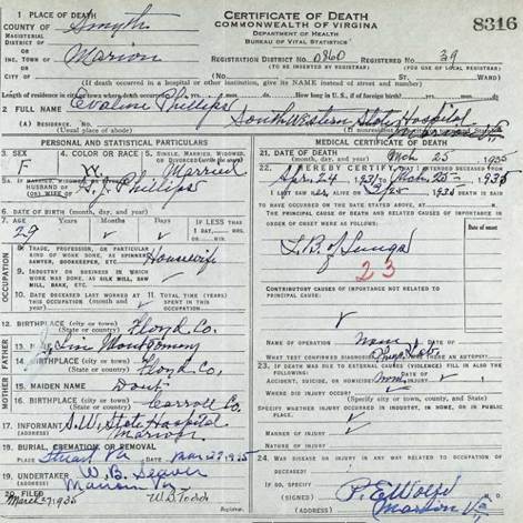 1937 Burial: Preston Phillips Cemetery, SR 619, Indian Valley, VA. (aka Henderson Phillips Cemetery) (no photo) |