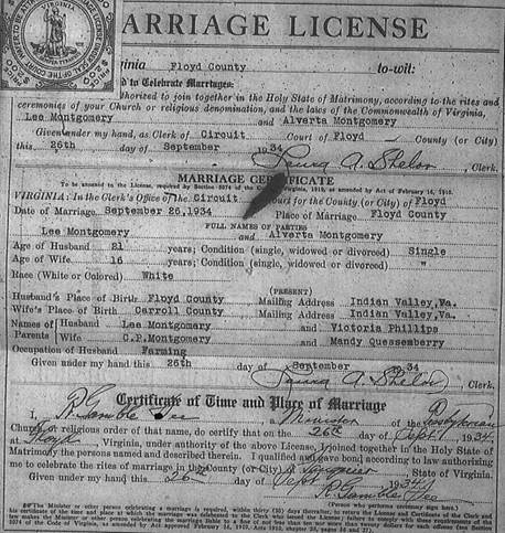 Parents: Caswell Parker “Babe” & Amanda "Mandy" (Quesenberry) Montgomery. 1918 Birth: 10-5-1918 Pine Creek, Carroll Co., VA. 1920, 1930 Residence: Floyd Co., VA with widowed father. 1934 Marriage #1: Alverta Montgomery m. Lee Montgomery 9-25-1934 Floyd Co., VA. Lee Montgomery, s/o Landon Iredel “Lennie” & Victoria (Phillips) Montgomery. [Montgomery_Caswell_Christina_ccva]