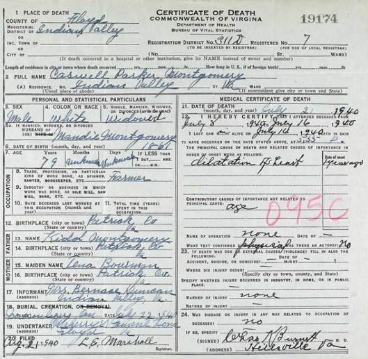 Parents: Caswell P. “Kid” & Christina (Bowman) Montgomery. 1861 Birth: 1861 VA. 1870 Floyd Co., VA, Indian Valley Twp, H214: Caswell 9 yo w/m, b. VA, at home. 1880 Floyd Co., VA, Indian Valley District, H22: Caswell 18 yo w/m, b. VA, farmer, school. 1890 Residence: Floyd Co., VA, Indian Valley District: …… Montgomery, Caswell P. 25 yo. (alone or with family of a different surname) 1900 Floyd Co., VA, Indian Valley District 15, H91: C. P. 38 Montgomery, yo single w/f wood chopper, b. (no mon) 1861 VA, owns farm, HOH (mother & brother). 1906 Marriage #1: C. P. Montgomery m. Mandy Quesenberry 3-8-1906 Carroll Co., VA. He 35 yo single w/m, b. Carroll Co., VA, s/o C. P. & Christina Montgomery. She 26 yo single w/f, b. Floyd Co., VA, d/o John & Nancy Quesenberry. 1910 Residence: Floyd Co., VA, Indian Valley District 48, H41: ...... Montgomery, Caswell P. 45 yo w/m farmer, b. VA, parents b. VA, M1 4y, owns farm, HOH. ............ Amanda 33 yo wife, b. VA, parents b. VA, M1 4y, 2 children with 2 living, cannot read/write. ............ Annie B. 3 yo daughter, b. VA, parents b. VA. ............ Caswell P. Jr 11/12 son, b. VA, parents b. VA. 1920 Residence: Floyd Co., VA, Indian Valley District 96, H24: ...... Montgomery, Caswell P. 51 yo widowed w/m farmer, b. VA, parents b. VA, owns with mortgage, HOH. ............ Annie B. 12 yo daughter, b. VA, parents b. VA. ............ Alverta 1 yo daughter, b. VA, parents b. VA. 1930 Residence: Floyd Co., VA, northwest part of Indian Valley District 8, H10: ...... Montgomery, Caswell P. 62 yo widowed w/m farmer, b. VA, parents b. VA, owns, HOH. ...... Phillips, Annabell 22 yo married daughter, b. VA, parents b. VA, 19 yo when 1st married. ...... Montgomery, Alverta 10 yo daughter, b. VA, parents b. VA, school. 1940 Residence: Floyd Co., VA, Indian Valley District 32-10, SR 613, H157: ...... Montgomery, Lee 25 yo w/m farm operator, b. VA, completed G0, resided in same house 1935, owns, HOH. ............ Alverta 21 yo wife, b. VA, completed G5, resided in same house 1935, housework. ............ Lilly 4 yo daughter, b. VA, completed G0. ............ Junior 1 yo son, b. VA, completed G0. ............ Cazwell 80 yo widowed father, b. VA, completed G5, resided in same house 1935, unable to work. 1940 Death: 7-21-1940 Indian Valley, Floyd Co., VA.