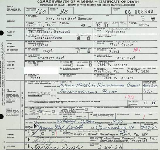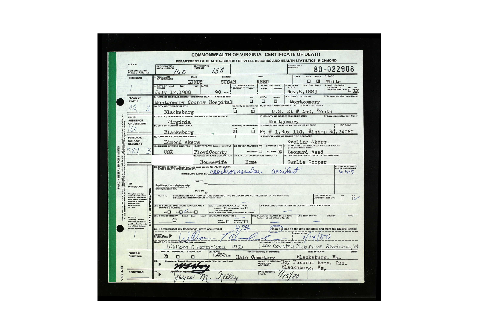 Eva Howell Basham, 7-17-1967 Christiansburg, Montgomery Co., VA. He 53 yo