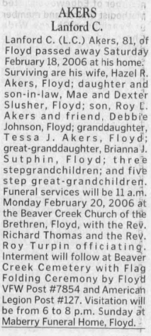 Parents: Hiley & Rachel (Akers) Reed. 1865 Birth: 2-1865 VA. 1870, 1880, 1890 Residence: Floyd Co., VA with parents. 1895 Marriage #1: Amos m. 1st Maderra Wade abt 1895. 1900 Residence: Floyd Co., VA, Indian Valley District 16, H144: Reed, Amos 25 yo w/m farmer, b. Feb 1865 VA, parents b. VA, m. 5y, owns farm, HOH. Madora 22 yo wife, b. Aug 1877 VA, parents b. VA, m. 5y, 2 children with 2 living. Hettie E. 4 yo daughter, b. Oct 1895 VA, parents b. VA. Nettie A. 1 yo daughter, b. Apr 1899 VA, parents b. VA. 1904 Marriage #1: Amos Reed m. Sarah Reed 1-21-1904 Floyd Co., VA. He 38 yo widowed w/m, b. Floyd Co., VA, s/o Hiley & Rachel Reed. She 26 yo single w/f, b. Floyd Co., VA, d/o Peter & Nancy Reed. Sarah Susan Reed, d/o Peter & Nancy Jane (Akers) Reed. [reed_sarah] 1910 Residence: Floyd Co., VA, Indian Valley District 47, H190: Reed, Amos 43 yo w/m farmer, b. VA, parents b. VA, M2 5y, owns farm, HOH. Sarah 32 yo wife, b. VA, parents b. VA, M1 5y, 1 child with 1 living. Hettie E. 14 yo daughter, b. VA, parents b. VA, school. Nettie A. 10 yo daughter, b. VA, parents b. VA, school. Highley E. 9 yo son, b. VA, parents b. VA, school. Elbert L. 4 yo son, b. VA, parents b. VA. Reed, Peter 80 yo married father-in-law, b. VA, parents b. VA, M1 50y, no occupation. (wife in another household) [reed_sarah] 1920 Residence: Floyd Co., VA, Alum Ridge District 88, H58: Reed, Amos 51 yo w/m stock farm laborer, b. VA, parents b. VA, rents, HOH. Sarah S. 42 wife, b. VA, parents b. VA. Hiley E. 18 yo son, b. VA, parents b. VA, stock farm laborer. Elbert L. 13 yo son, b. VA, parents b. VA, school. John W. 8 yo son, b. VA, parents b. VA, school. Martin L. 6 yo son, b. VA, parents b. VA. Amos J. 4y 2/12 yo son, b. VA, parents b. VA. 1920-1930 Death of Amos Reed: 1920-1930 Burial of Amos Reed: 1930 Residence: Montgomery Co., VA, Christiansburg District 14, H79. Reed, Sarah 53 yo widowed w/f, b. VA, parents b. VA, rents, HOH. John W. 18 yo son, b. VA, parents b. VA, farm laborer. Martin L. 16 yo son, b. VA, parents b. VA, farm laborer. Amos 14 yo son, b. VA, parents b. VA, farm laborer. |
