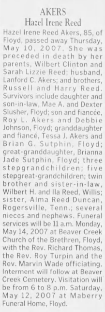 Parents: William Alsaberry & Allie L. (Harman) Reed. 1922 Birth: 5-11-1922 VA. 1930 Residence: Floyd Co., VA with parents. 1992 Death: 7-11-1992. 1992 Burial: Sunset Cemetery, Christiansburg, Montgomery Co., VA.