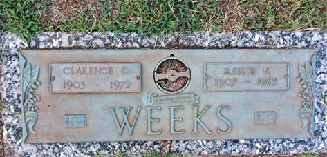 Parents: Stafford Thomas & Osha Allis B. (Weeks) Weeks. 1903 Birth: 12-27-1903 Floyd Co., VA. 1910: 1920 Residence: Roanoke City, VA with parents. 1934 Marriage #1: Clarence Cecil Weeks m. Juanita Massie Hall 3-22-1934 VA. She 26 yo single w/f, b. Floyd, VA, d/o John W. Hall & Flora M. Whitenack. Juanita Massie Hall, b. 5-29-1907 Floyd Co., VA, d. 9-6-1965 Roanoke City, VA, d/o John Wesley & Flora M. (Whitenack) Hall. [Hall_David_Abigail] 1972 Death: 8-13-1972. 1972 Burial: Blue Ridge Memorial Gardens, Roanoke City, VA.