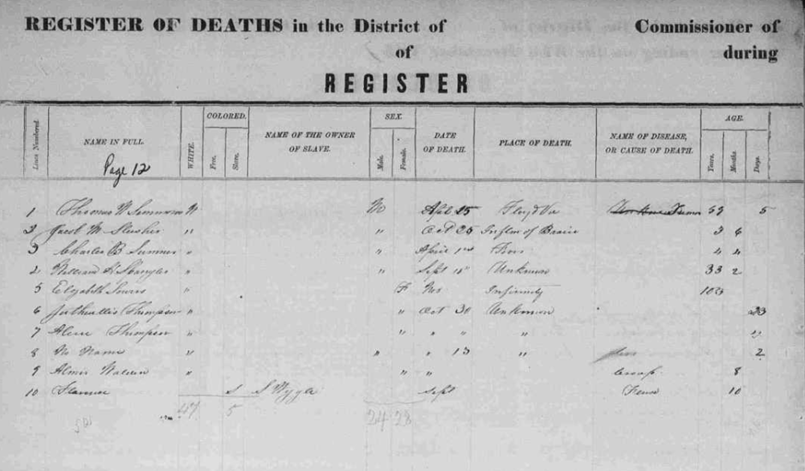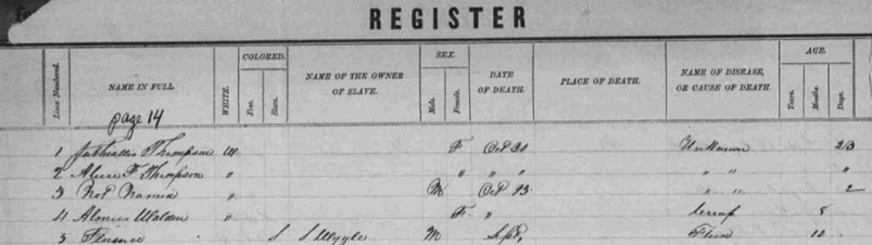 Elizabeth Thompson, Juthiullis {f} Thompson, Alene F. Weddle, not named male Walden, Almer {f} Fluma male slave of S. Wygle |