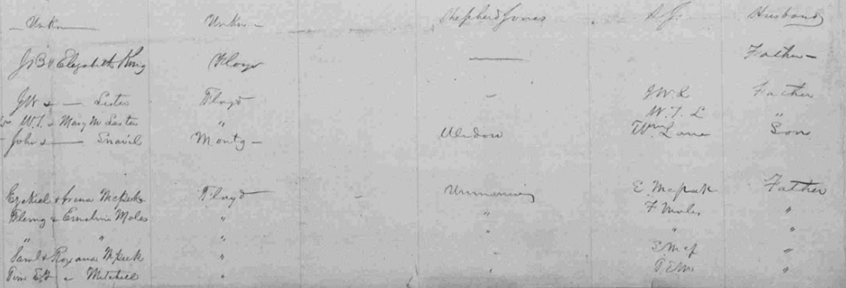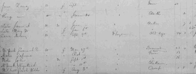 Jones, Nancy King, not named male Lester, James A. Lester, Mary M. Lane, Mary McPeak, Susannah R. Moles, Sabrina Moles, John McPeak, Hezekiah Mitchell, Sarah Kildu |