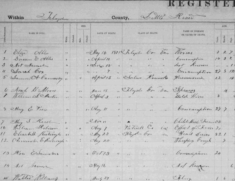 the year Bollen, Sarah L. Bowman, Amanda C. Dobyns, Thomas M. Hall, Sarah Hylton, Margaret Ann Lester, Abner Phlegar, Lucinda Spangler, William M. Shelor, Charles Sumner, Aaron Thomas, John L. |