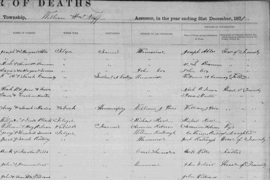 1872 Ables, Eliza Ables, Susan Brammer, not named female Cox, Sarah Cannaday, Samuel A. Moore, Noah B. Martin, William L. Price, Mary E. Reed, Mary S. Robinson, William Rutrough, Elisabeth Rutrough, Amanda E. Saunders, Rose E. Vest, not named male Williams, Walter |