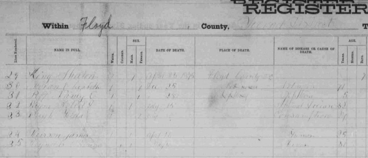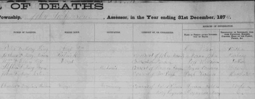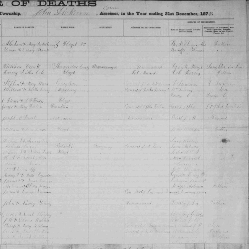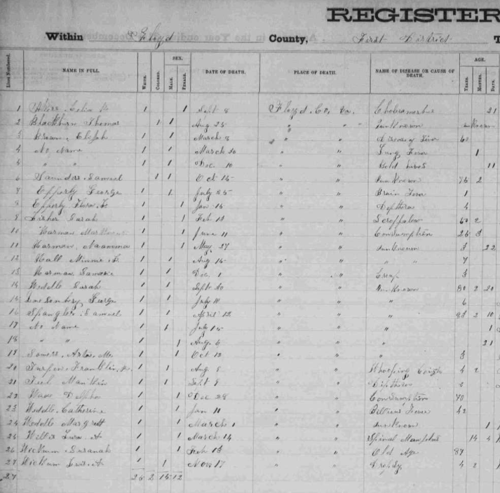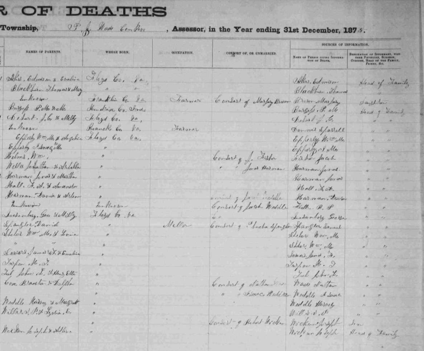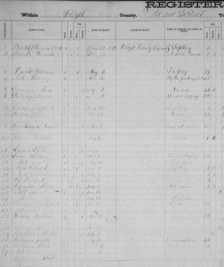 2nd District Image 148 Beckelhimer, Wm A. Banks, Thomas Cronk, William Cole, Harvey Duncan, Ann Dulaney, James Fiedge, Joseph H. Foster, William Hornbarger, Margaret Jones, Austurlia Lane, Alpha Lane, William Lester, not named female Moore, Robert L. Moore, Eulalia Poff, Perry M. Reynolds, Alvin Ridinger, not named female Scaggs, stillborn Simmons, Joseph H. surnamed not given, not named male Tinsley, Narcissus Winfrey, not named female Walters, Abelia Williams, Joseph Williams, Sarah Williams, not named female Wa__, _brettie {f} |