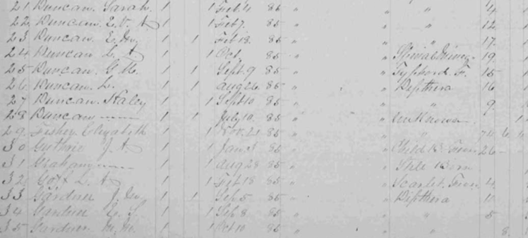1st District Image 178 Akers, Rachel Akers, D. {m} Akers, M. {f} Akers, C. {m} Alley, C. M. {f} Boyd, Lina A. Bolling, Meary J. Boyd, Amarida A. Bishop, Poley Conduff, Mandy Cox, S. {m} Cox, L. {f} Canady, M. E. {f} Dodd, G. A. {f} Dickerson, D. M. {f} Dobyns, B. E. {f} Duncan, L. C. {m} Duncan, F. H. {m} Duncan, not named female Duncan, Millard Duncan, Sarah Duncan, E. V. A. {f} Duncan, E. M. {m} Duncan, L. A. {f} Duncan, G. M. {m} Duncan, L. {m} Duncan, Haley {f} Duncan, not named male Fisher, Elizabeth Guthrie, J. A. {f} Graham, not named female Goff, L. A. {f} Gardner, J. M. {m} Gardner, E. S. {f} Gardner, M. M. {f} |