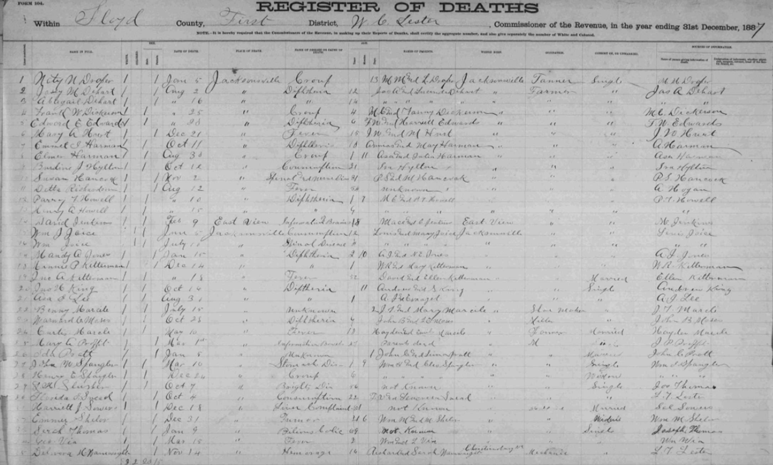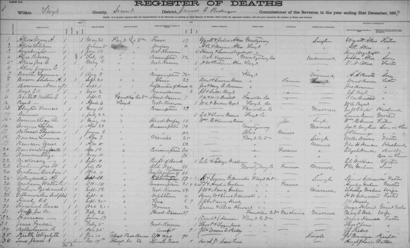 1887 Floyd County, Virginia Death Register