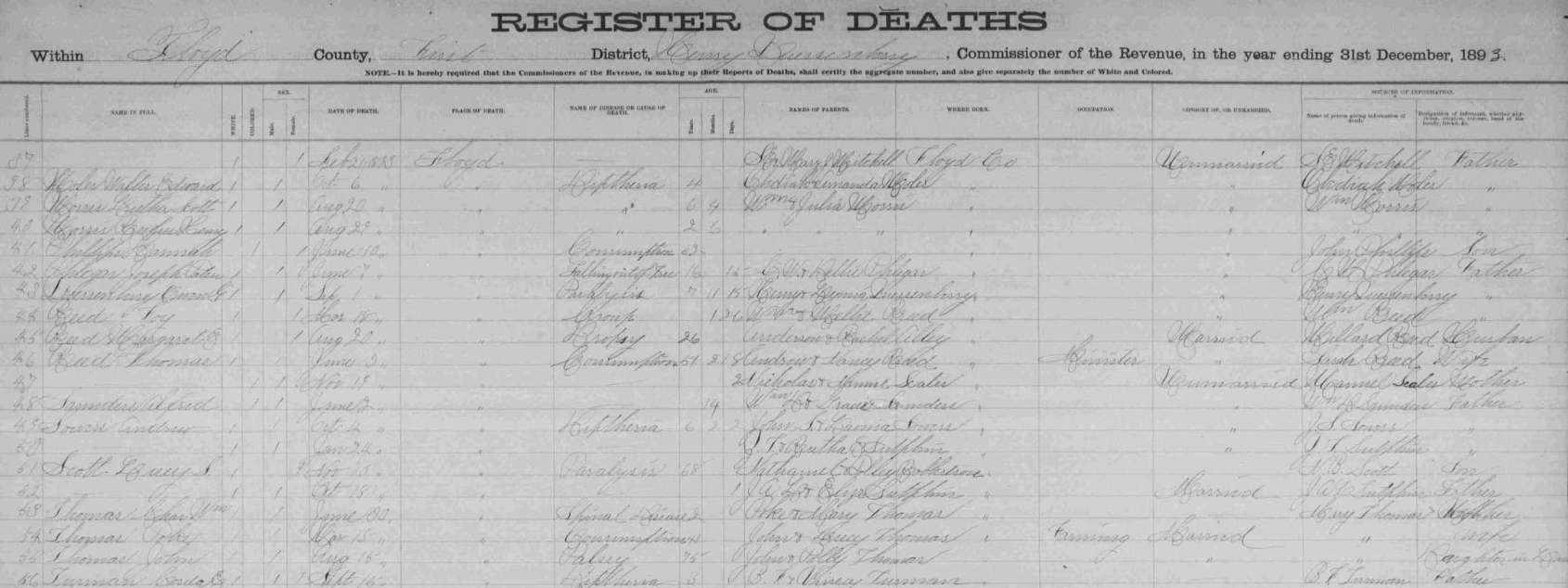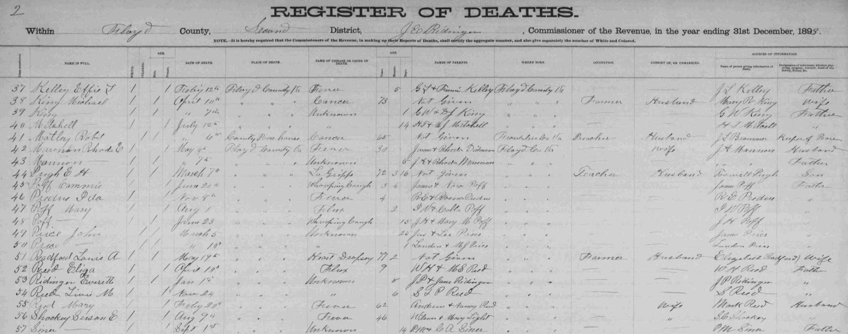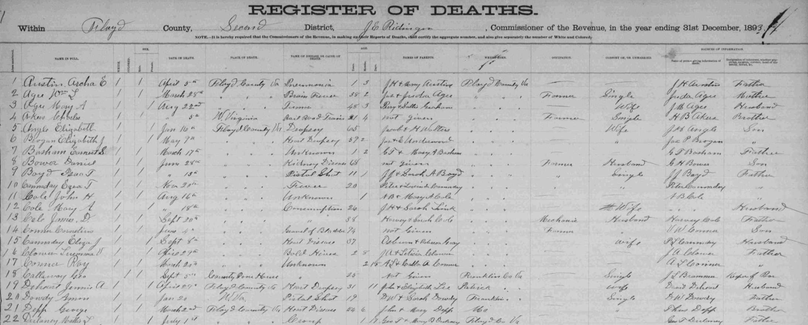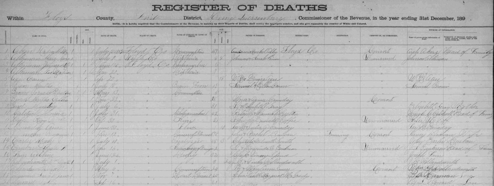 1893 Floyd County, Virginia Death Register