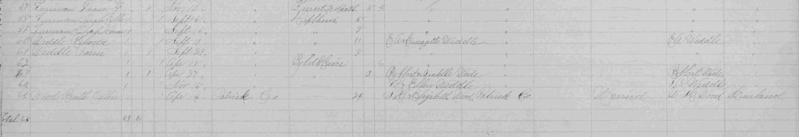 1st District Image 224 Mitchell, not named female Moles, Walter Edward Morris, Luther Scott Morris, Paulin Henry Phillips, Hannah Phlegar, Joseph Paten Quesenberry, Owen G. Reed, Foy Reed, Margaret E. Reed, Thomas Scales, not named male Saunders, Alfred Sowers, Andrew Sutphin, not named male Scott, Lucy Sutphin, not named male Thomas, Chas Wm Thomas, Poke Thomas, John Turman, Corda E. Turman, Isaac G. Turman, Sarah Ella Turman, Elijah Homer Weddle, Rhoda Weddle, Parris Weddle, not named female Wade, not named male Weddle, not named female Wood, Ruth Ellen |