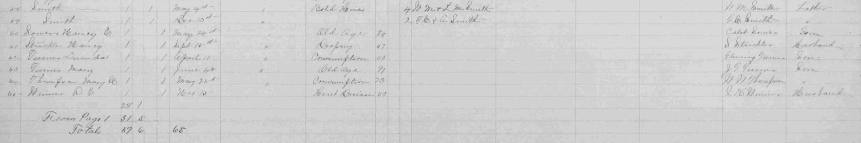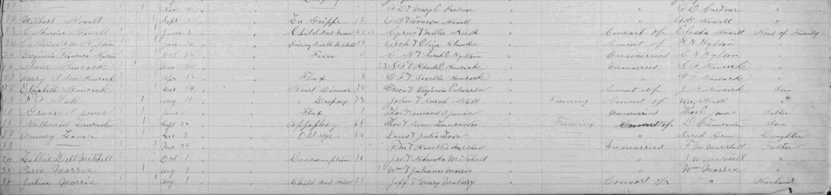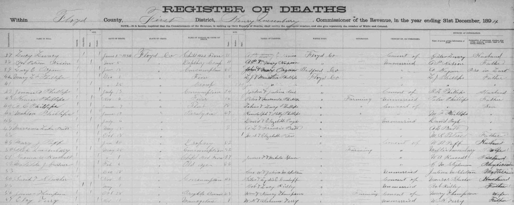1st District Image 228 Levacy, Lucy Nixion, Geo Patison Organ, Lucy E. Phillips, Mary L. Phillips, not named male Phillips, Jennie A. Phillips, Homer Phillips, A. C. {m} Phillips, Mahlon Pugh, not named male Pratt, Marcenina Laka Peters, not named Peters Poff, Mary J. Quesenberry, Alex Russell, Naoma A. Gardner, Matilda J. Shelton, not named female Slusher, Sarah T. Ridley, not named male Thompson, James Terry, Eloy Hylton, Bethuel Turner, Levina Turner, Lucy Anna Thomas, not named female Thomas, Ardeler Via, Loucindia A. Webb, James H. Weddle, James Lee Young, Sarah Young, not named female |