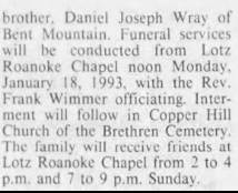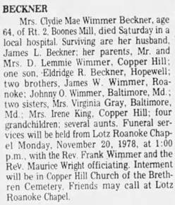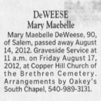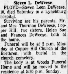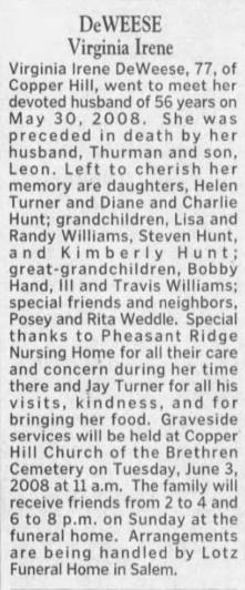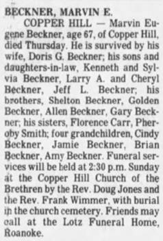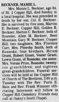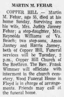 Copper Hill Church of the Brethren. Interment will follow at Copper Hill