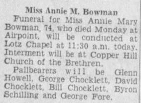 Flora Belle Bowman, d/o Benjamin & Julia Frances (Henry) Bowman.