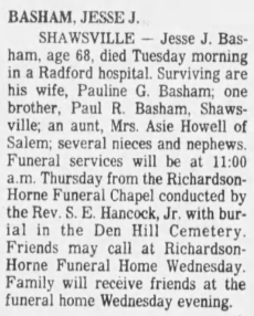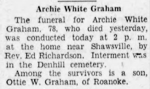 will follow in Den Hill Cemetery, Shawsville, VA. The Akers family