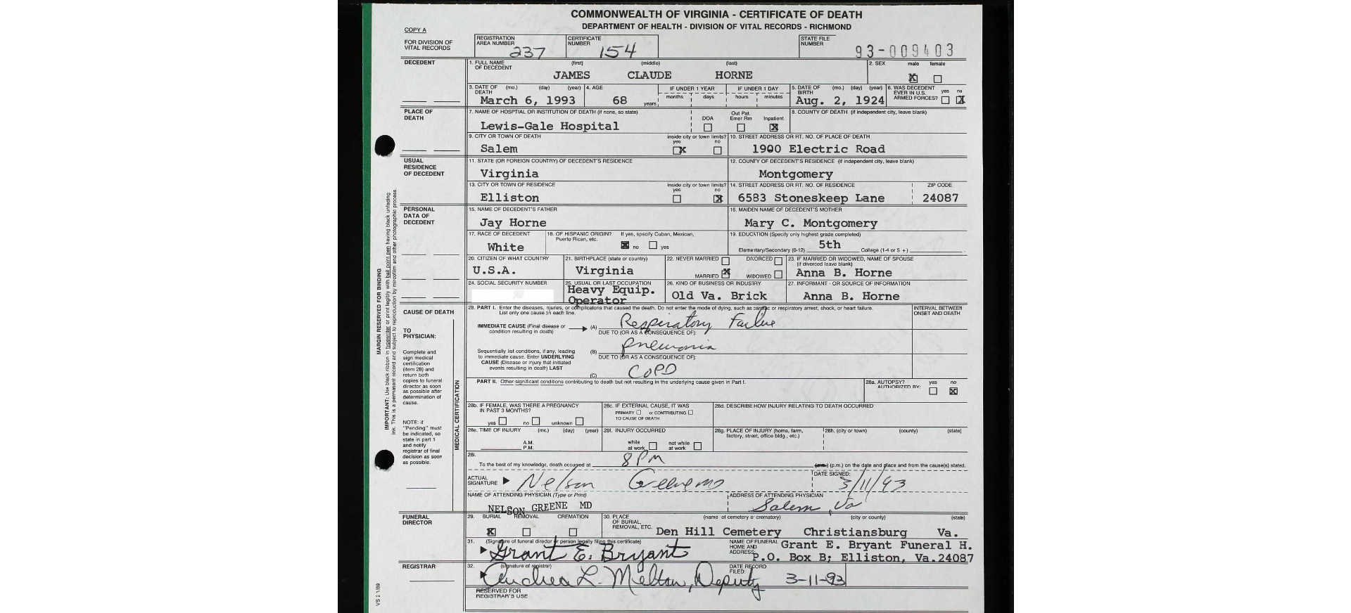 Horne Funeral Service, Christiansburg, Va. On line condolences may be sent