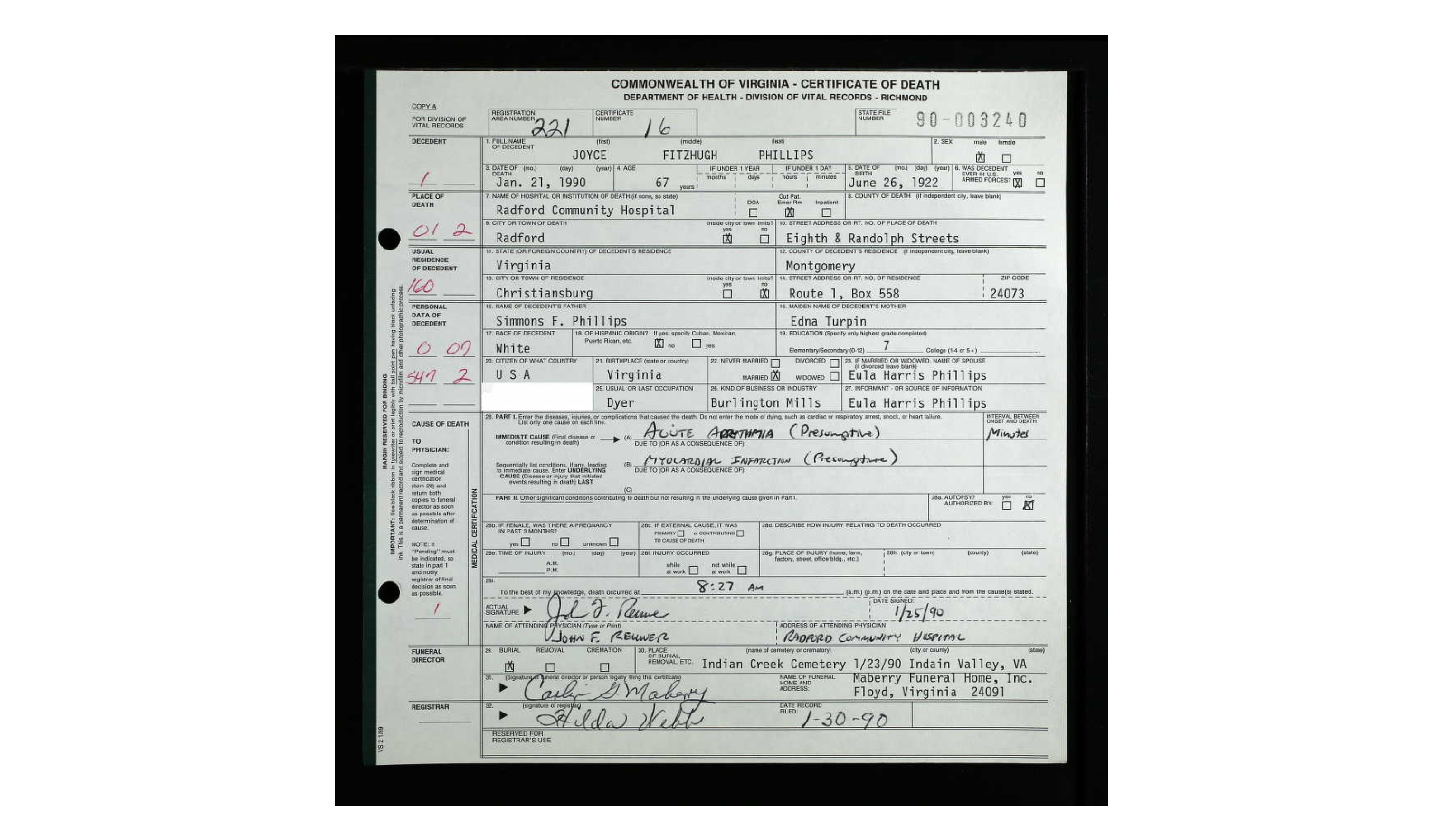 Preston & 1st wife Mary Elizabeth (Cox) Quesenberry. [Death Cert]